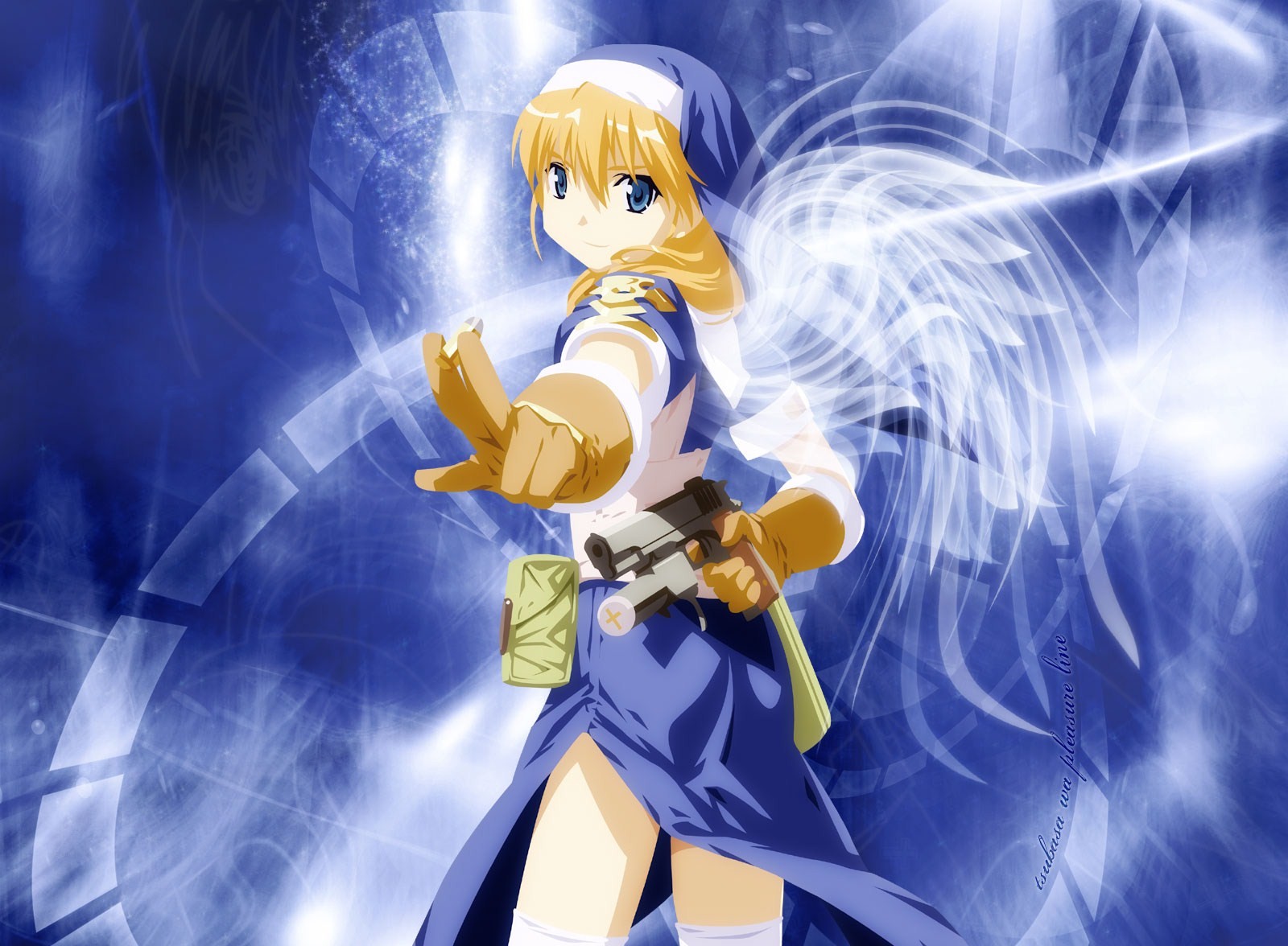 Description: A anime character with a sword and a blue background with white swirls and a blue angel with a white halo.
