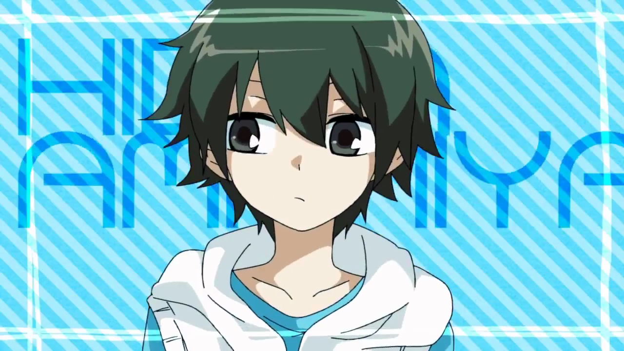 Description: A anime character with black hair and a white shirt on a blue background with the words yumejie.