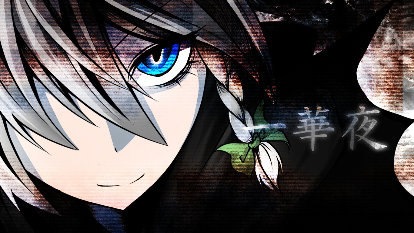 Description: A anime character with blue eyes and a black shirt with a flower in his hair and a black shirt with a green leaf on his chest.