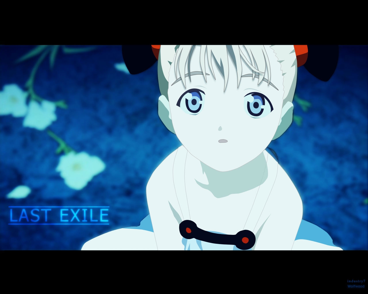 Description: A anime character with a blue eyes and a red bow around her neck and a black nose ring on her head.
