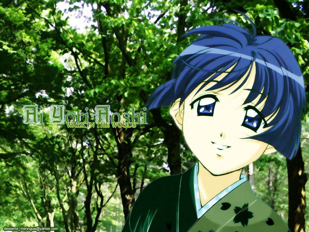 Description: A anime character with blue hair and green eyes in a forest with trees and grass in the background.