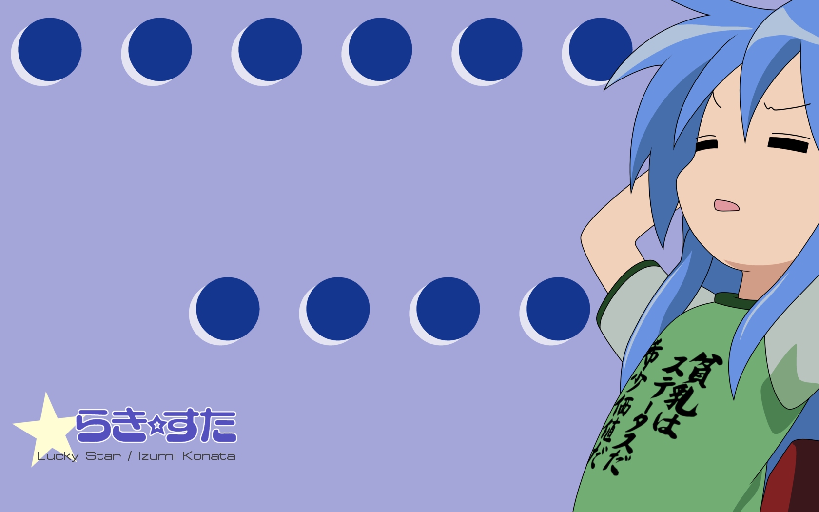 Description: A anime character with blue hair and a green shirt with a star on it and a blue background with circles.