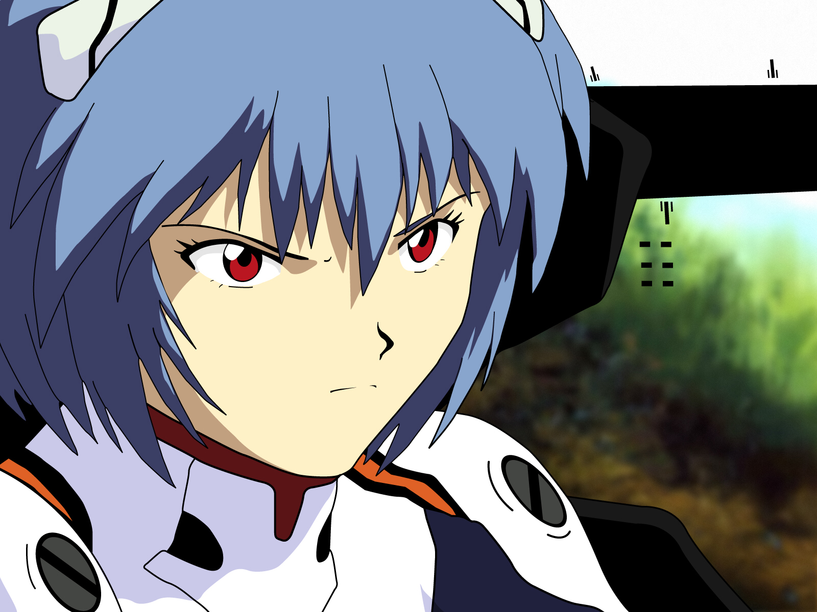 Description: A anime character with blue hair and red eyes looking at the camera with a cat ears on his head.