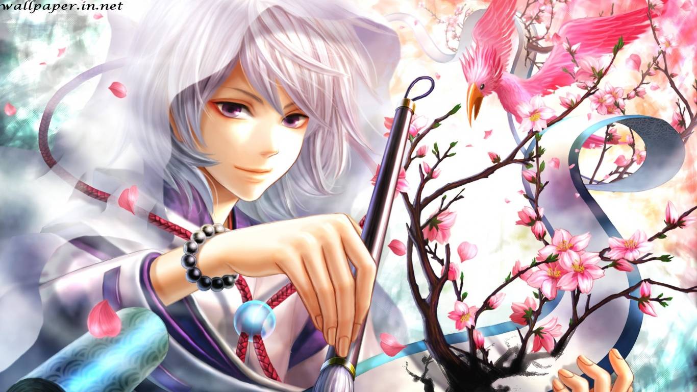 Description: A anime character holding a flower and a bird on a tree branch with a pink flower in the background.