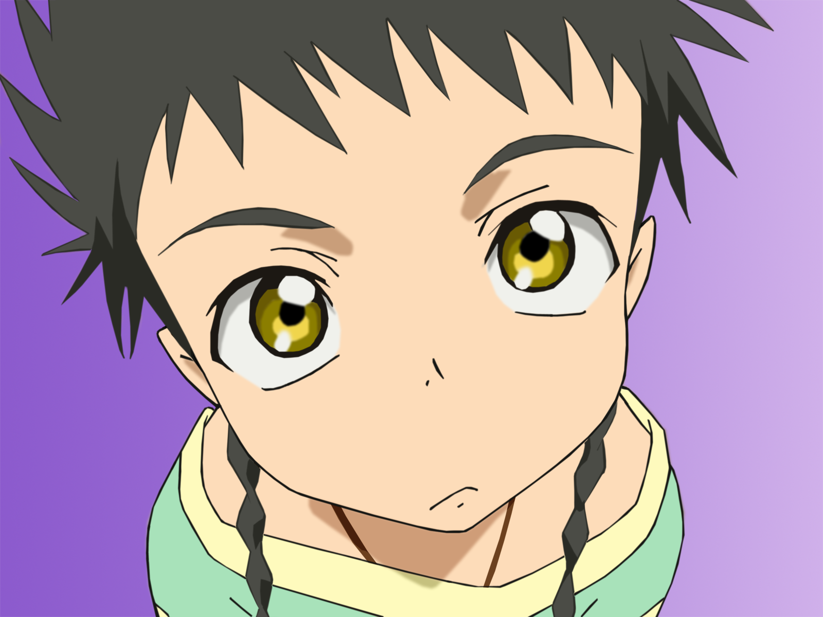 Description: A anime character with brown eyes and a green shirt on a purple background with a purple background and a purple background.
