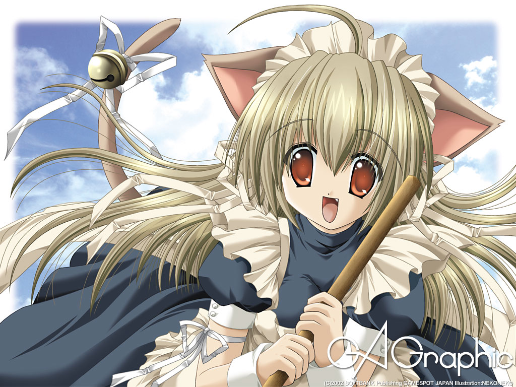 Description: A anime character with a broom and a cat ears on her head and a blue dress with white ruffles.