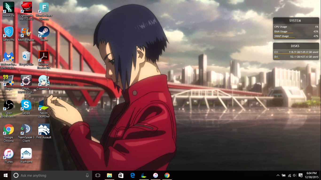 Description: A anime character looking at his cell phone in front of a cityscape with a red bridge in the background.