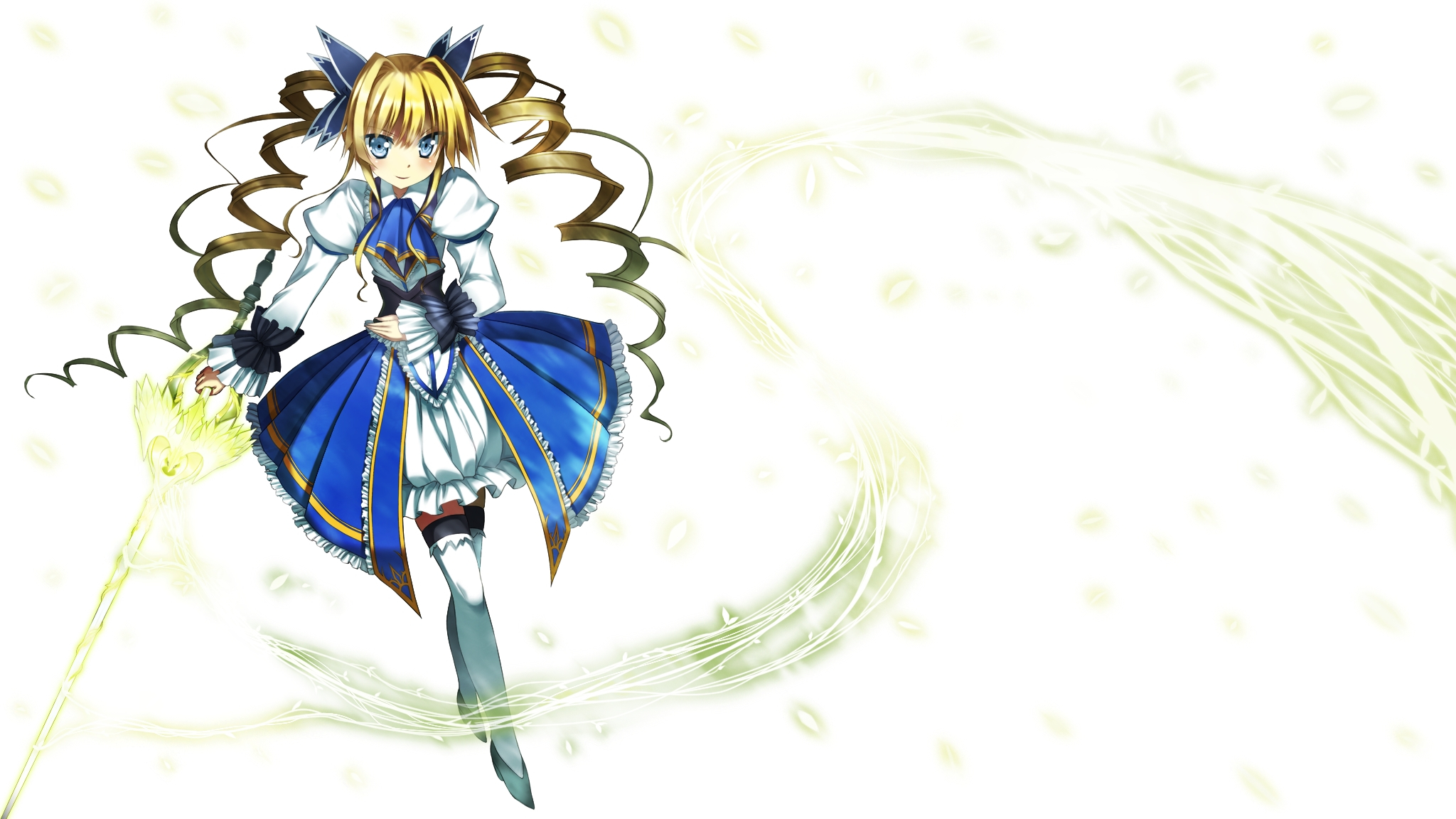 Description: A anime character with a sword and a dress on her body and a white background with a blue tail.