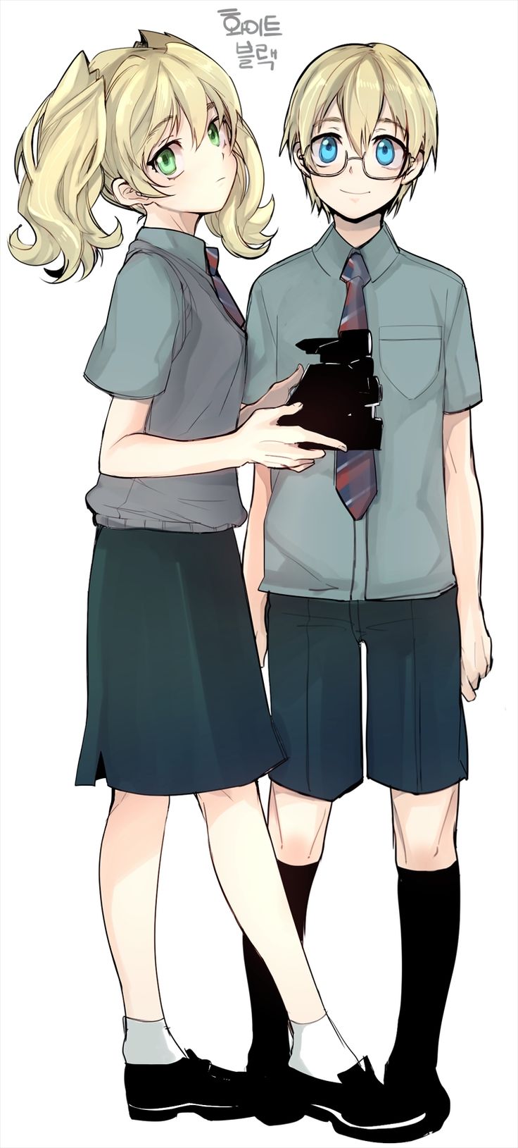 Description: Two anime characters are standing next to each other with their arms around each other.