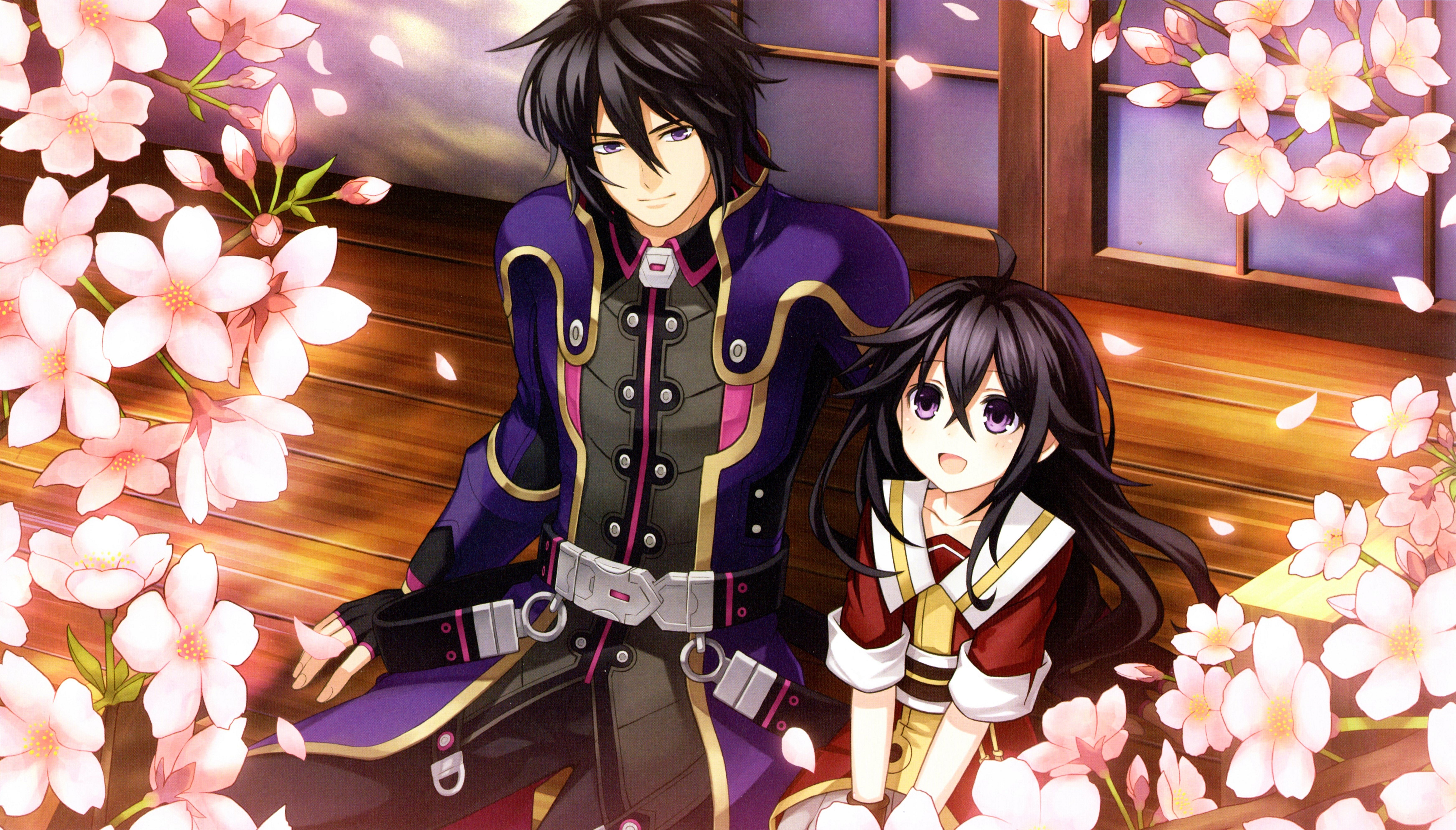 Description: Two anime characters sitting on a bench in front of flowers and a window with pink flowers in the background.