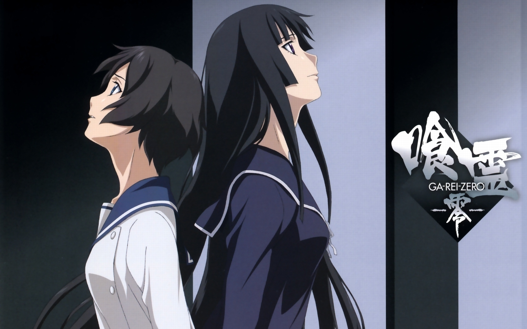 Description: Two anime characters standing next to each other in a room with a black and white wall and a black and white sign.