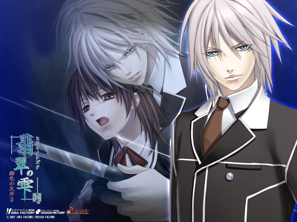 Description: Two anime characters are standing next to each other in front of a blue background with asian characters in the background.