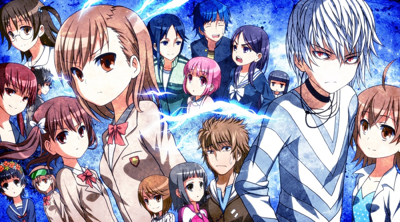 Description: A group of anime characters with blue background and blue background with white clouds and lightnings in the background.