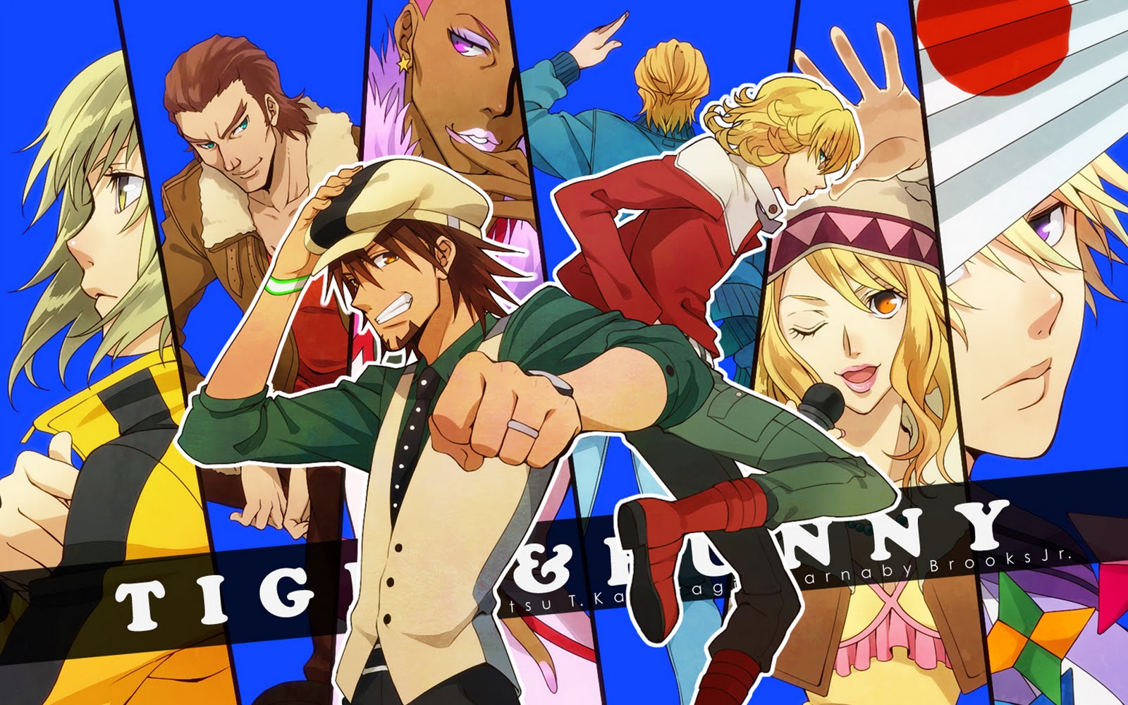 Description: A group of anime characters with a blue background and a red and white banner with the words tiger & bunny.