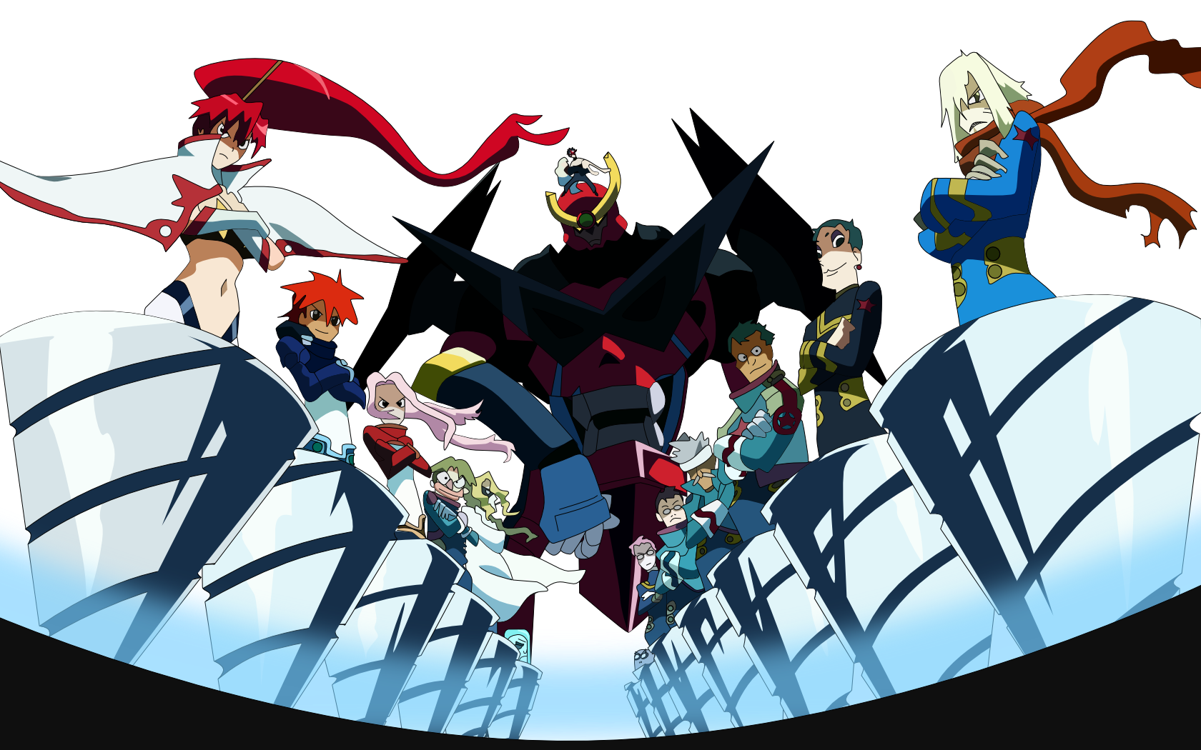 Description: A group of anime characters standing on a bridge together in front of a white background with a blue sky.