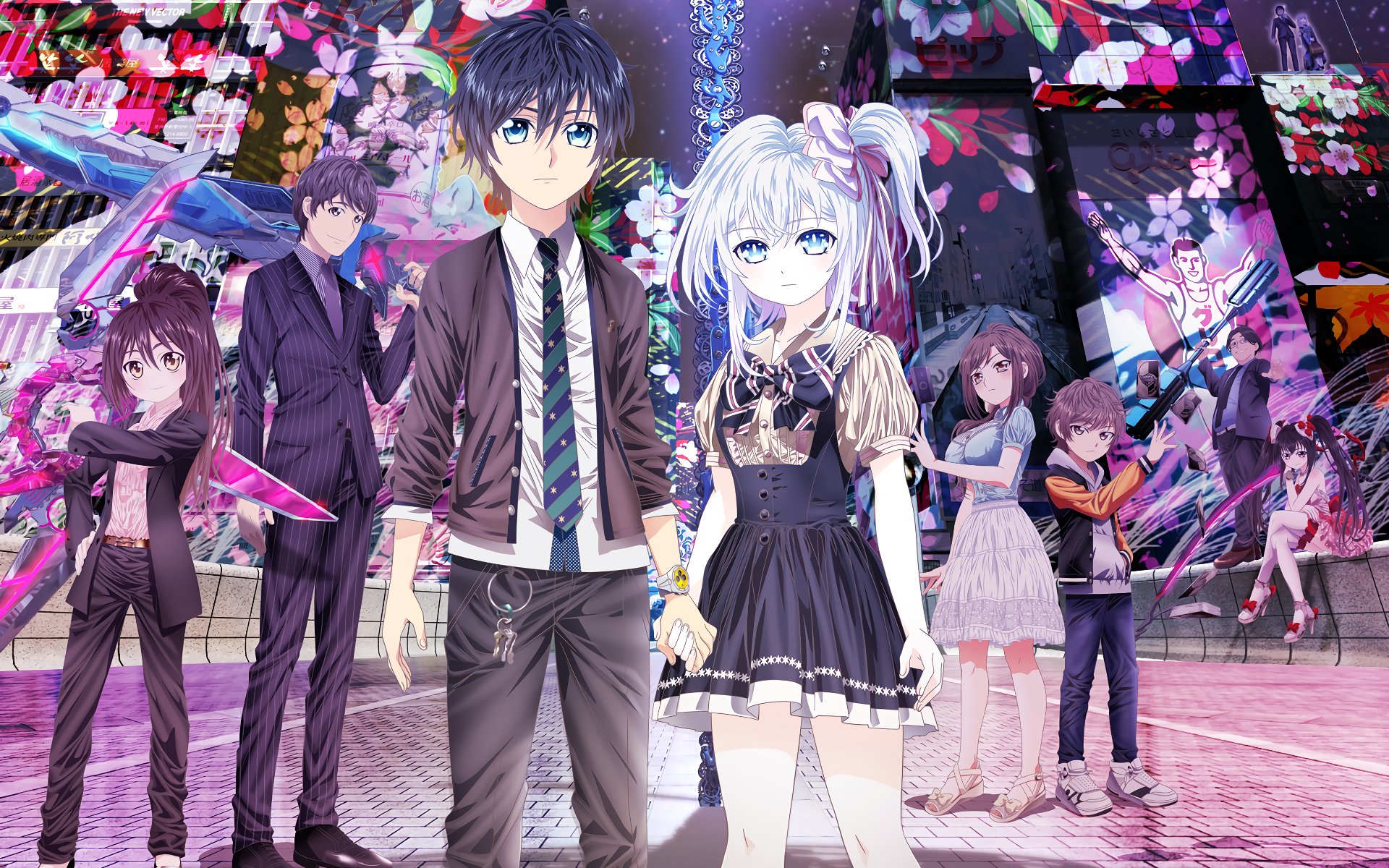 Description: A group of anime characters standing in front of a building with a lot of people around them and a woman in a dress.