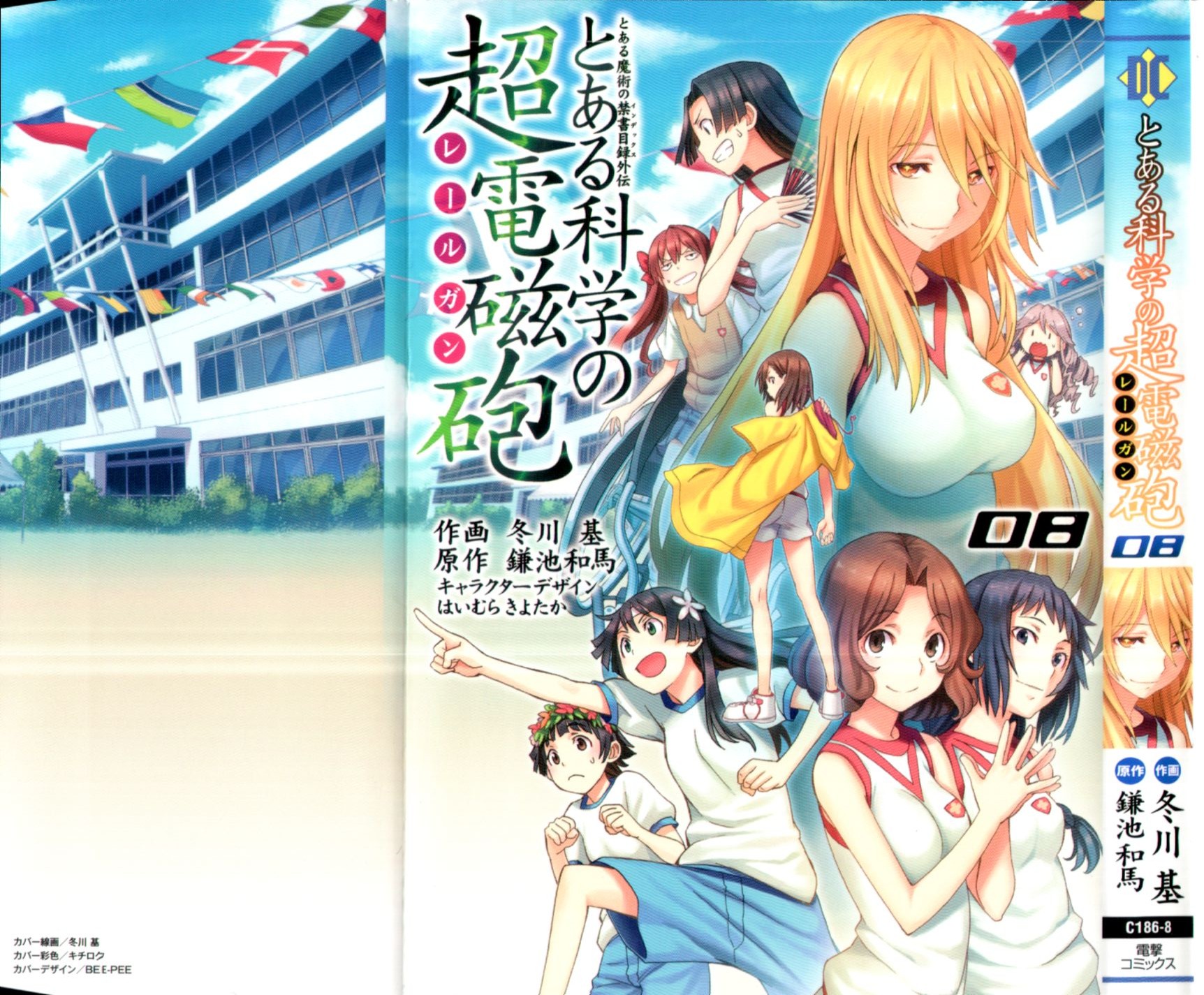 Description: A group of anime characters standing in front of a building with flags on it's sides and a banner in the middle.