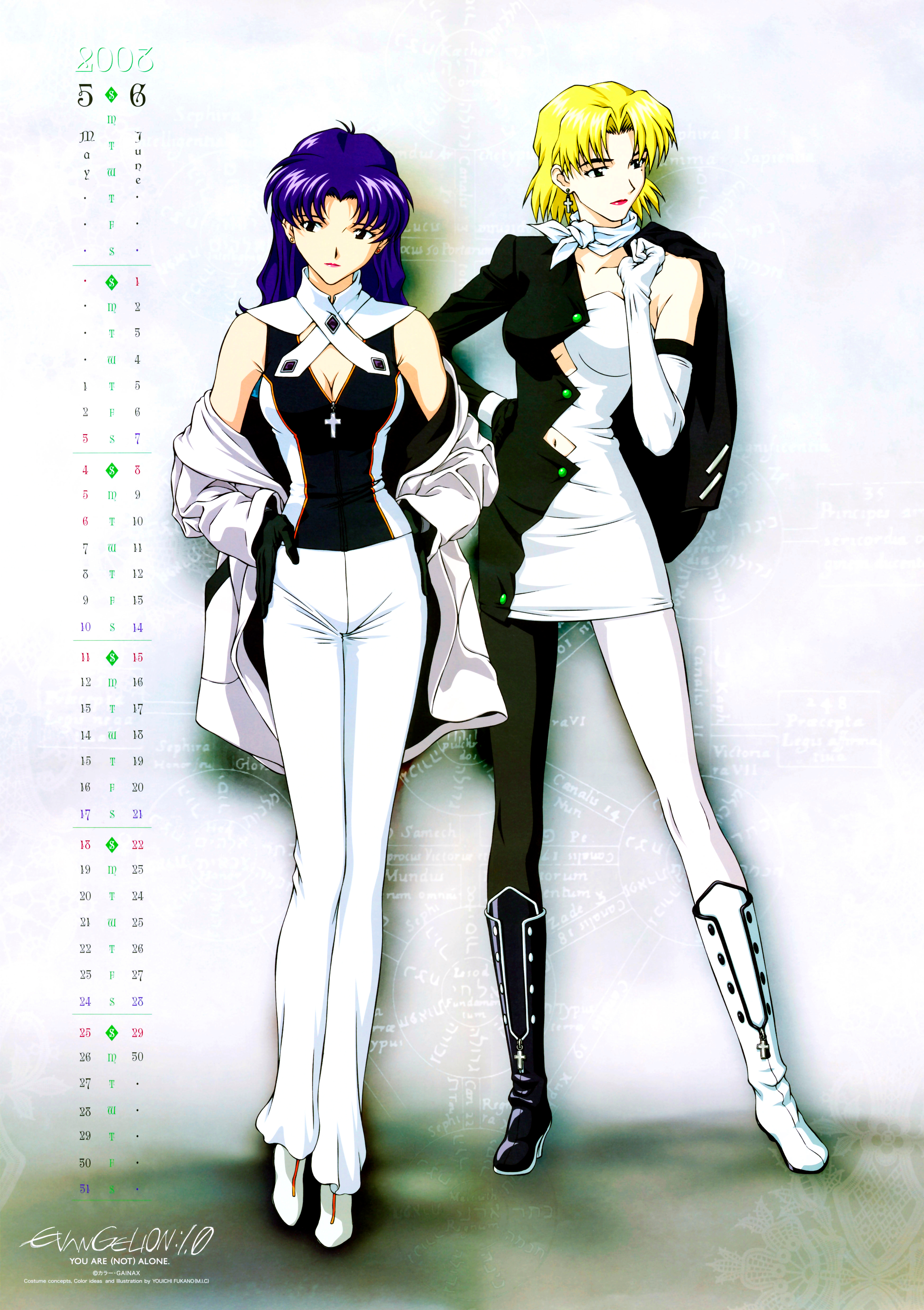 Description: Two anime characters are standing next to each other in front of a calendar with numbers on it and a date on the wall.