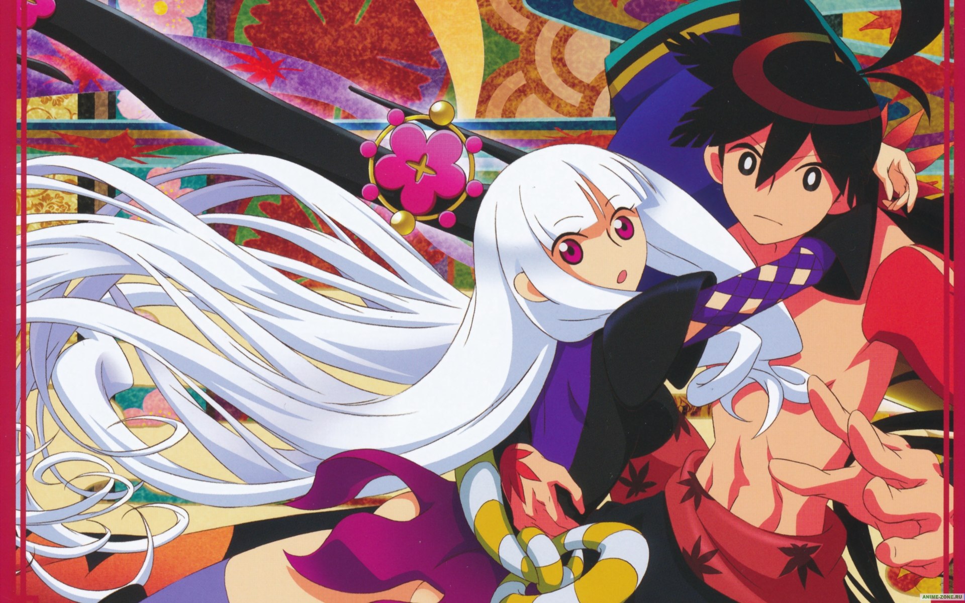 Description: A couple of anime characters in a cartoon scene with a background of flowers and a man with a hat.