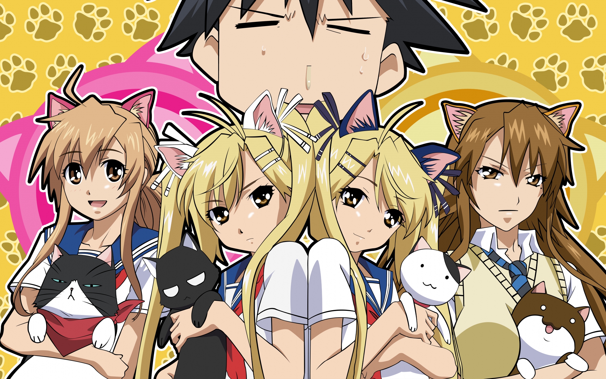 Description: A group of anime characters standing next to each other with cats on their backs and a cat on their shoulder.