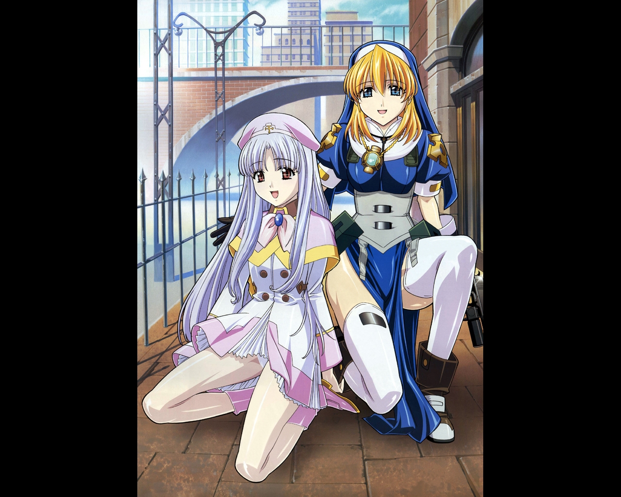 Description: Two anime characters sitting on a ledge in front of a cityscape with a bridge in the background.