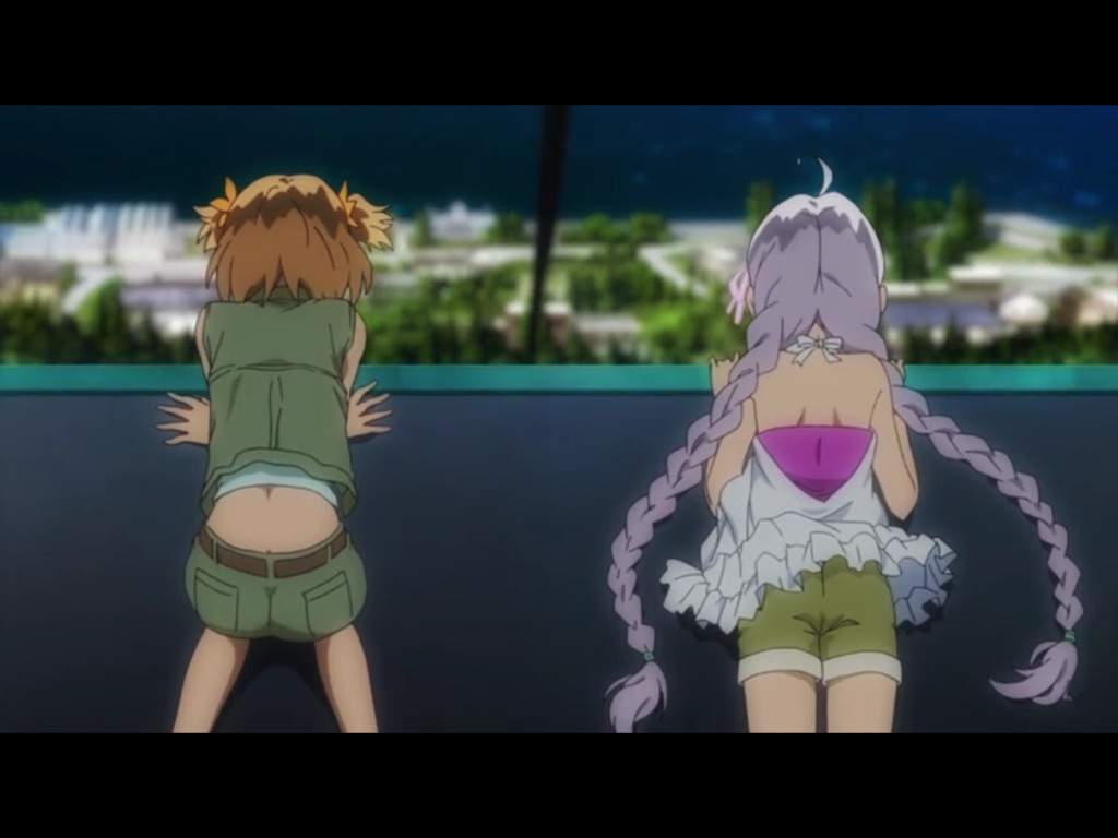 Description: Two anime characters are standing in front of a cityscape and one is wearing a green outfit and the other is wearing a green outfit.
