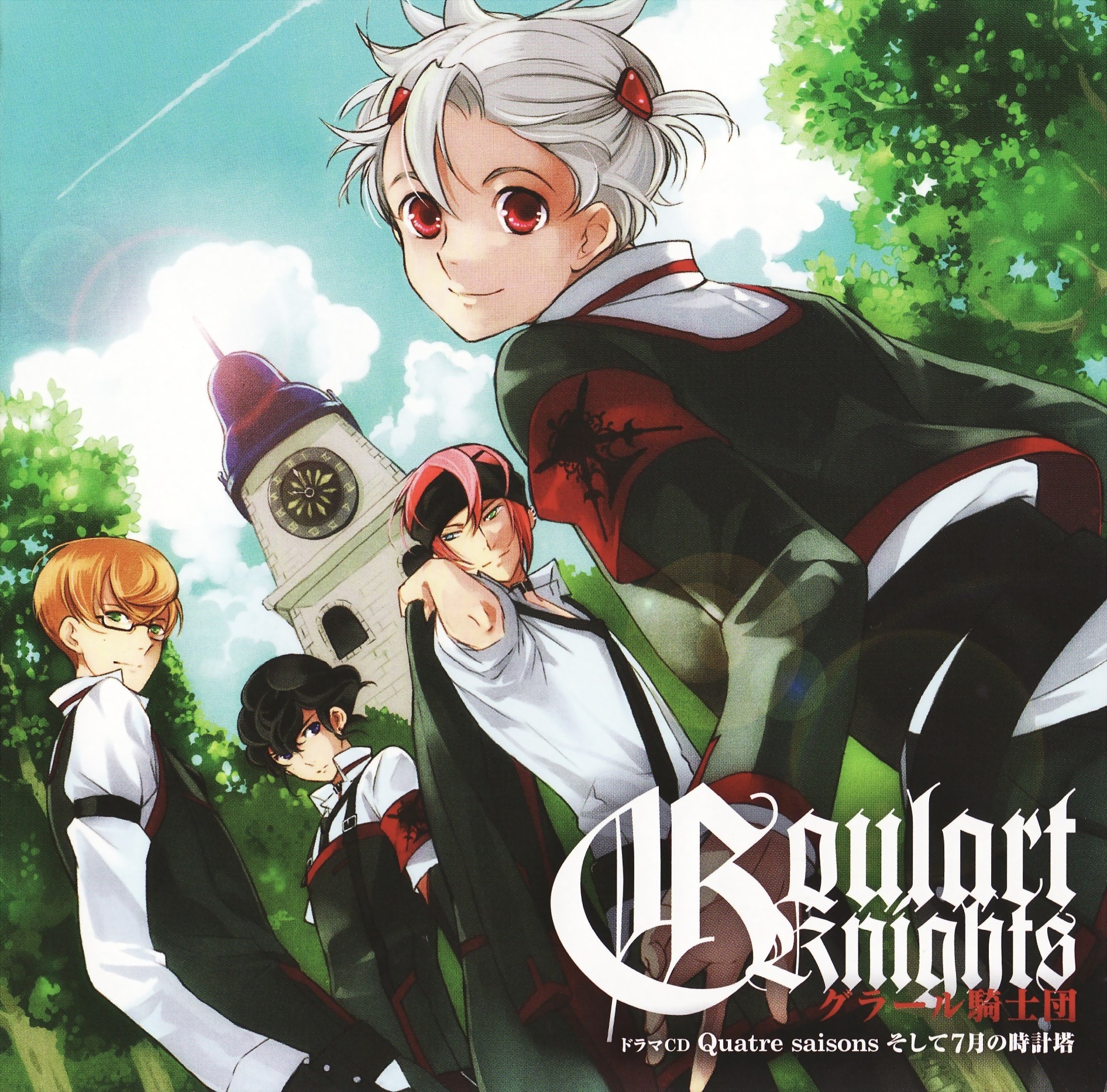 Description: A group of anime characters standing in front of a clock tower with trees in the background and a sky background.