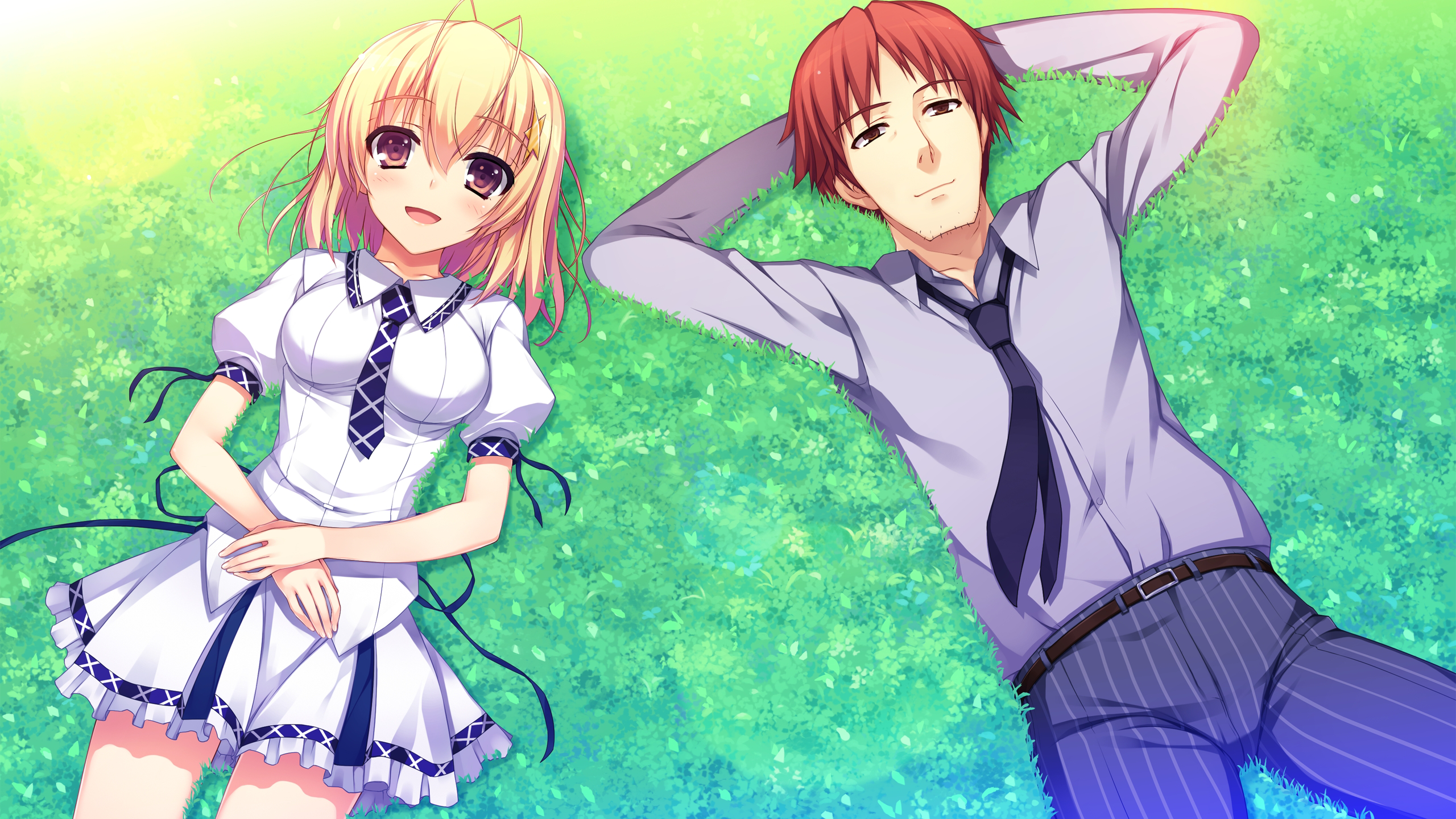Description: A couple of anime characters standing next to each other in front of a green field of grass and grass.