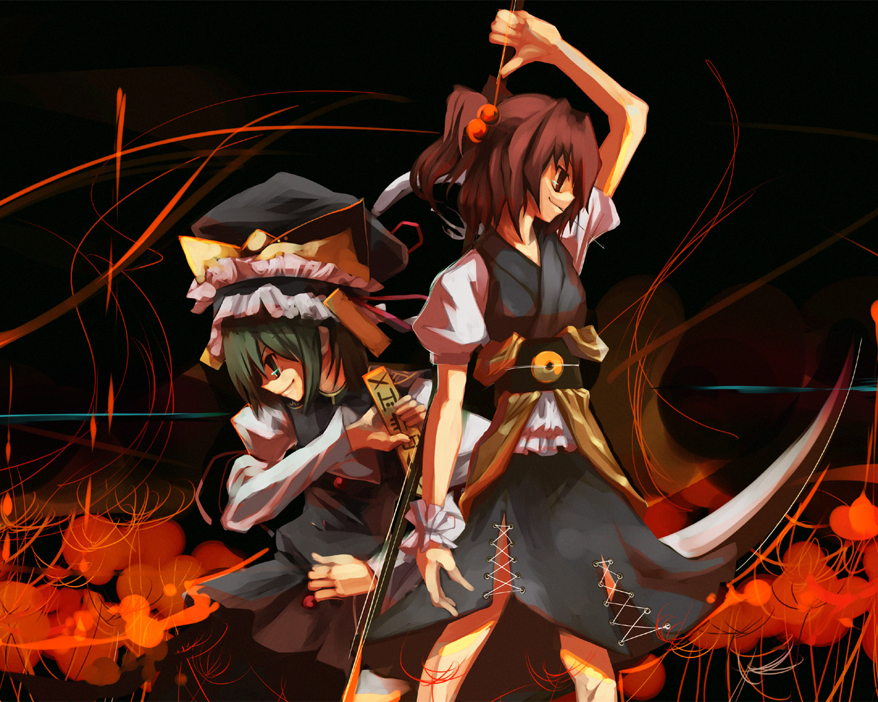Description: Two anime characters are standing in a field of flowers and holding swords and a sword in their hands.