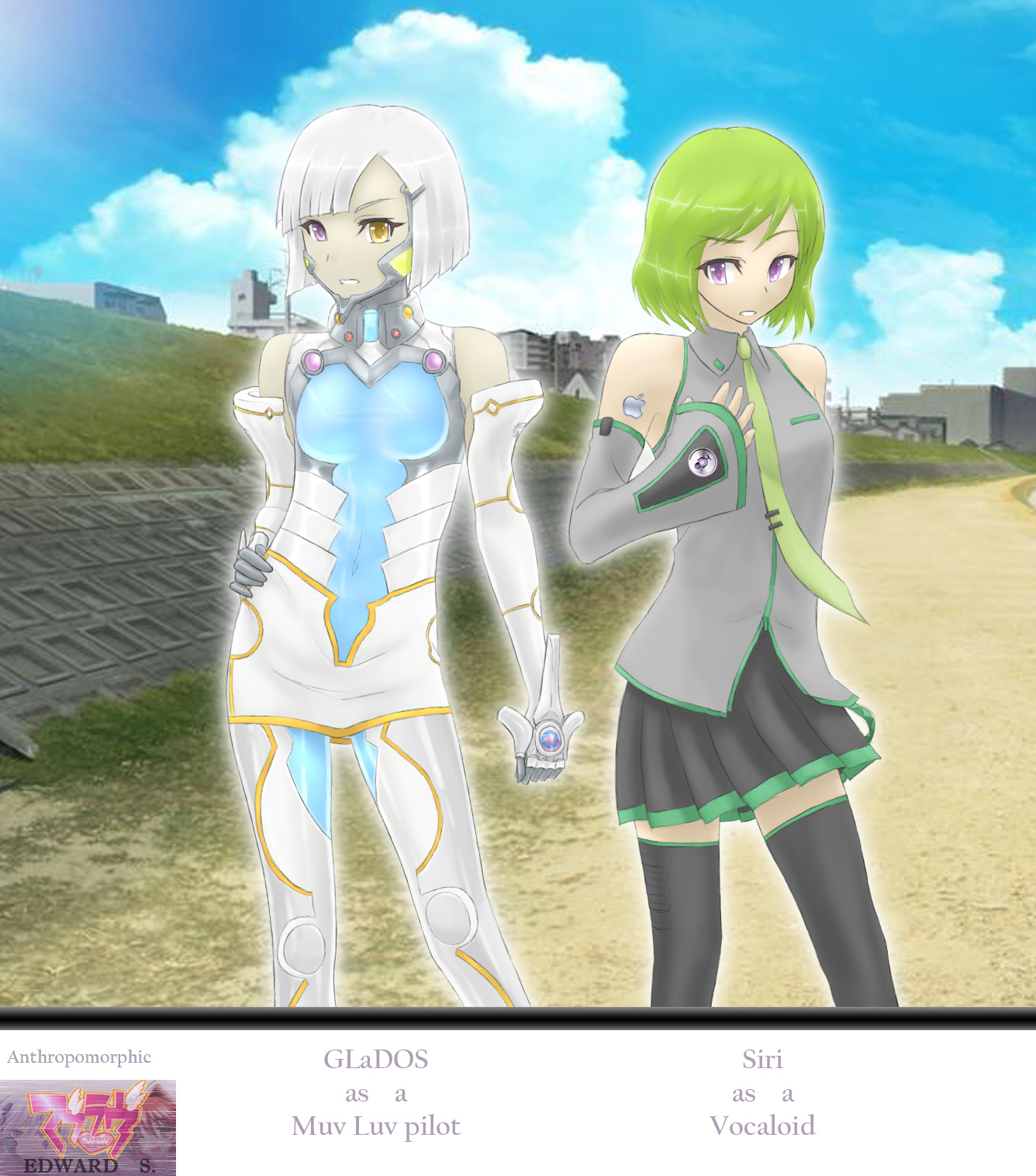 Description: Two anime characters standing next to each other on a field with a sky background and a building in the background.