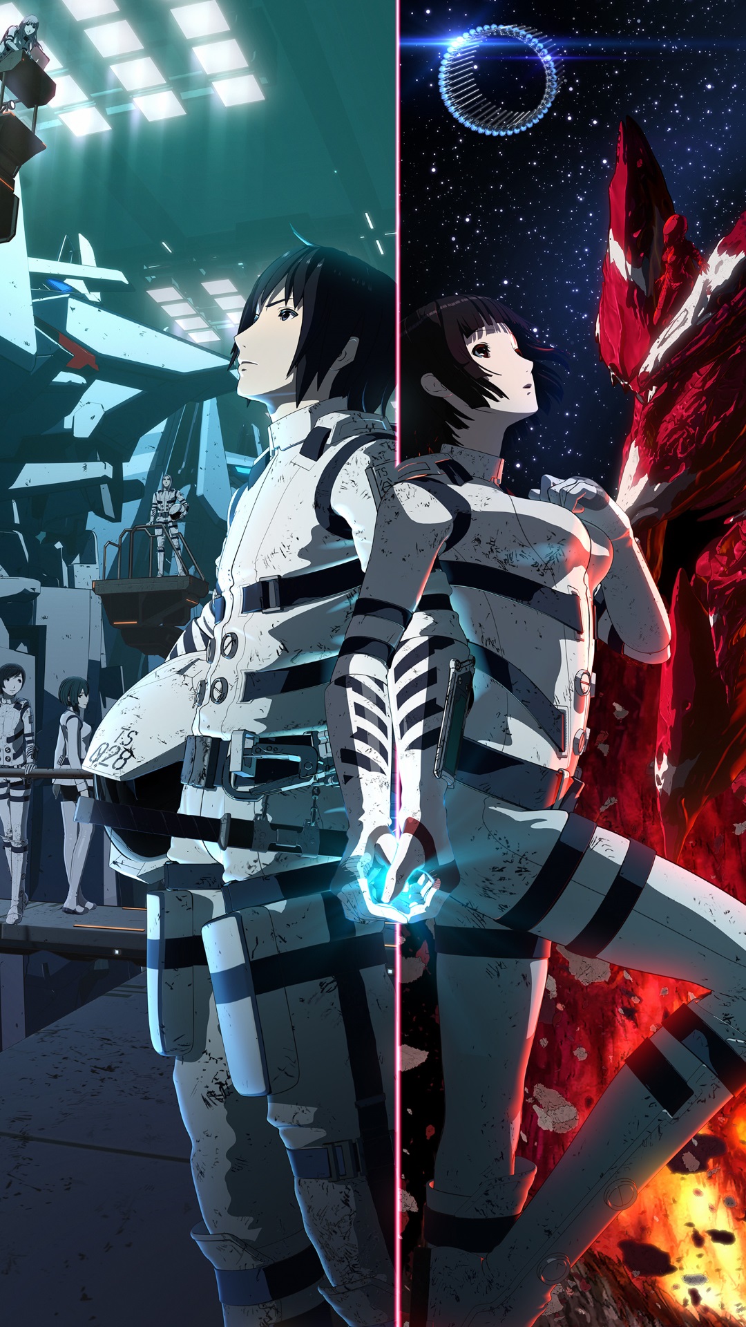 Description: Two anime characters standing in front of a fire and a space station with a rocket ship in the background.