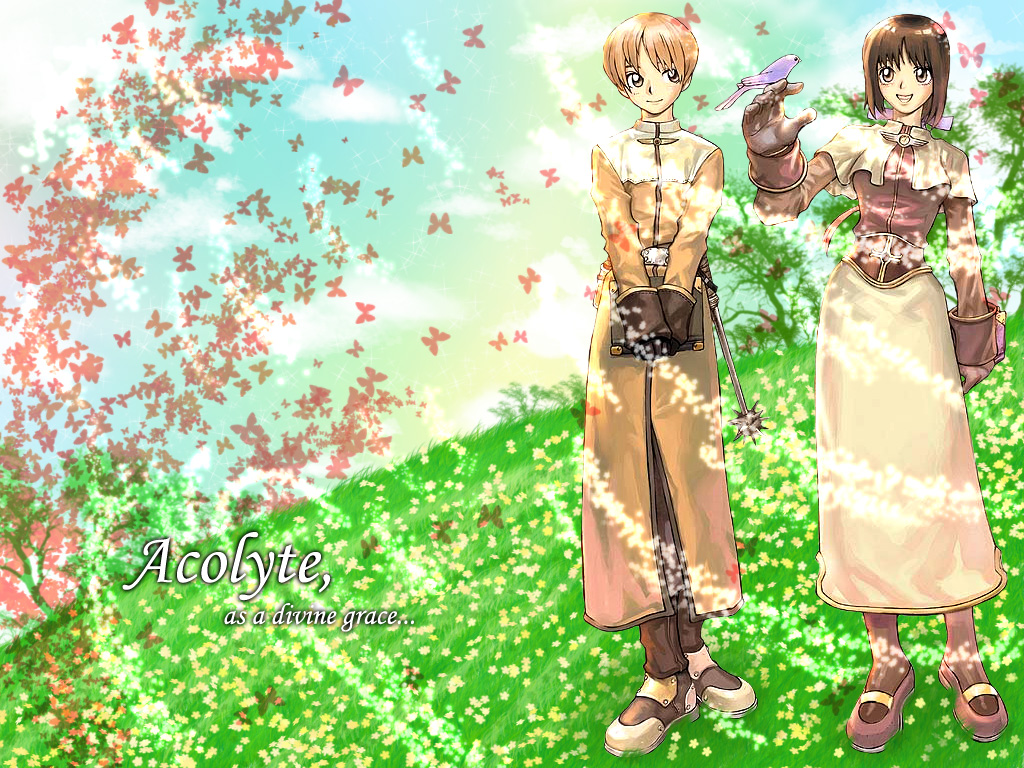 Description: Two anime characters standing in a field of flowers and grass with a sky background and a tree with pink flowers.