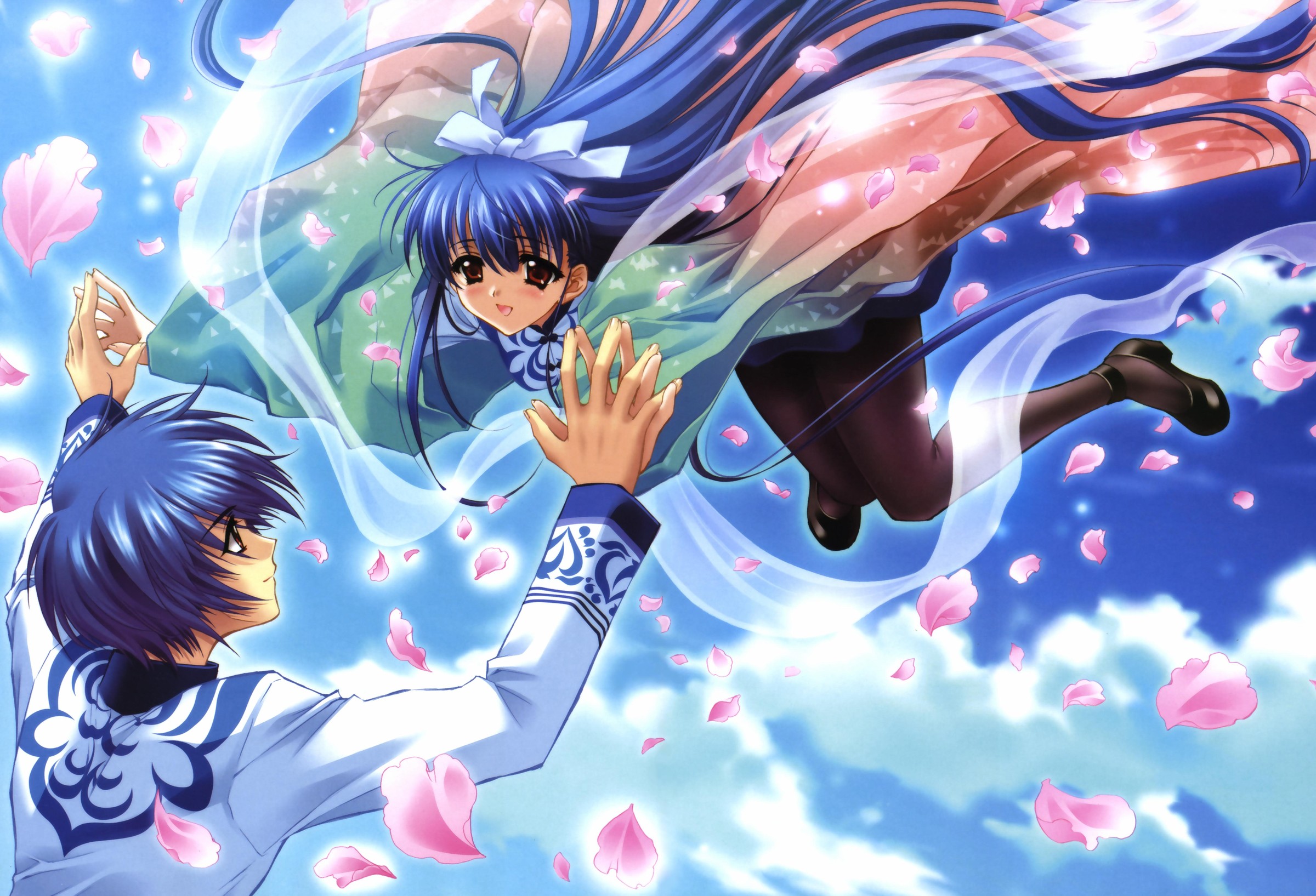 Description: A couple of anime characters flying through the air with petals in the air behind them and a blue sky with pink flowers.