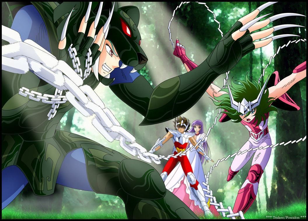 Description: A group of anime characters in a forest with chains hanging from their hands and hands in the air.