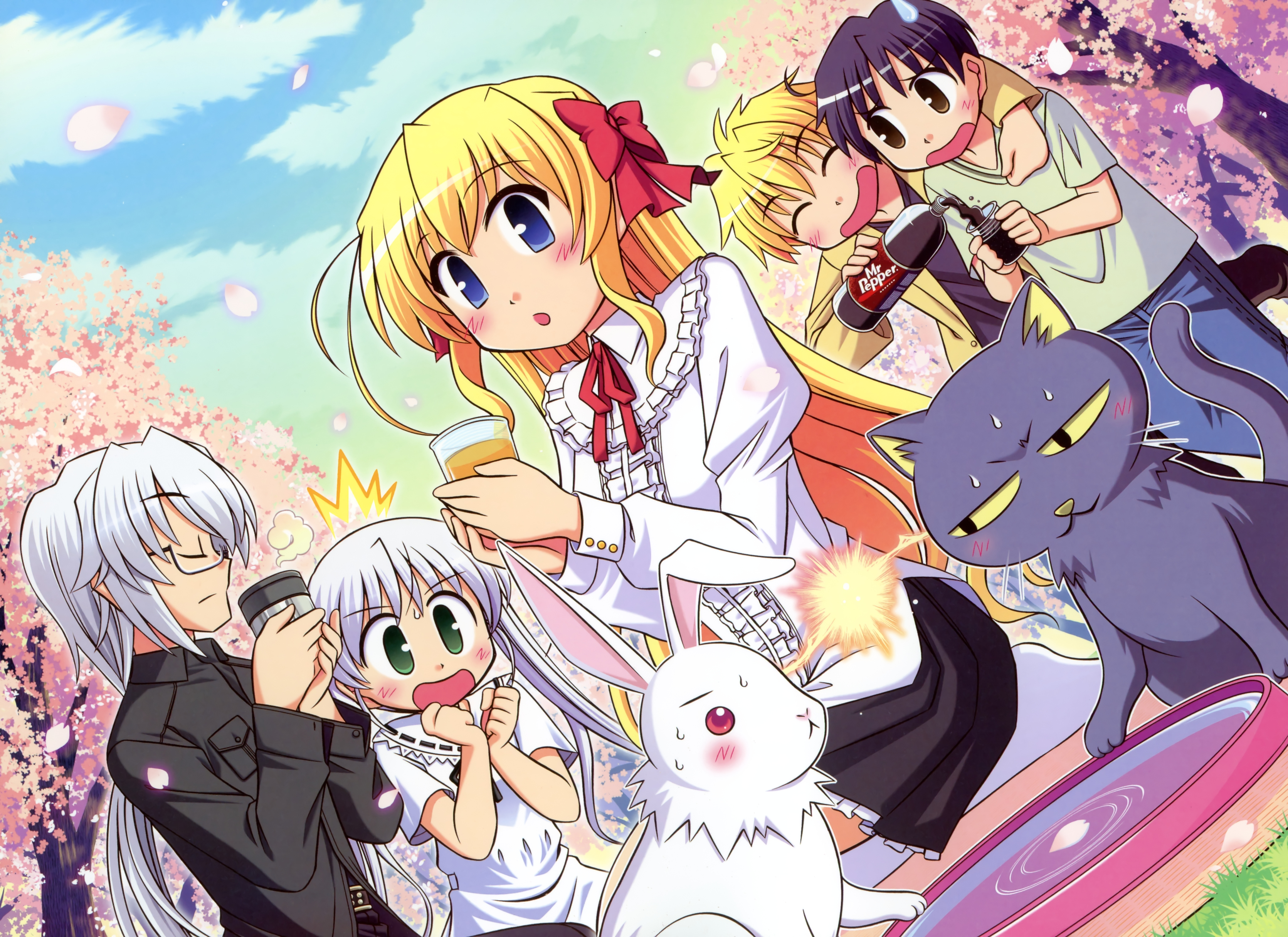 Description: A group of anime characters standing next to each other in front of a forest with flowers and trees in the background.