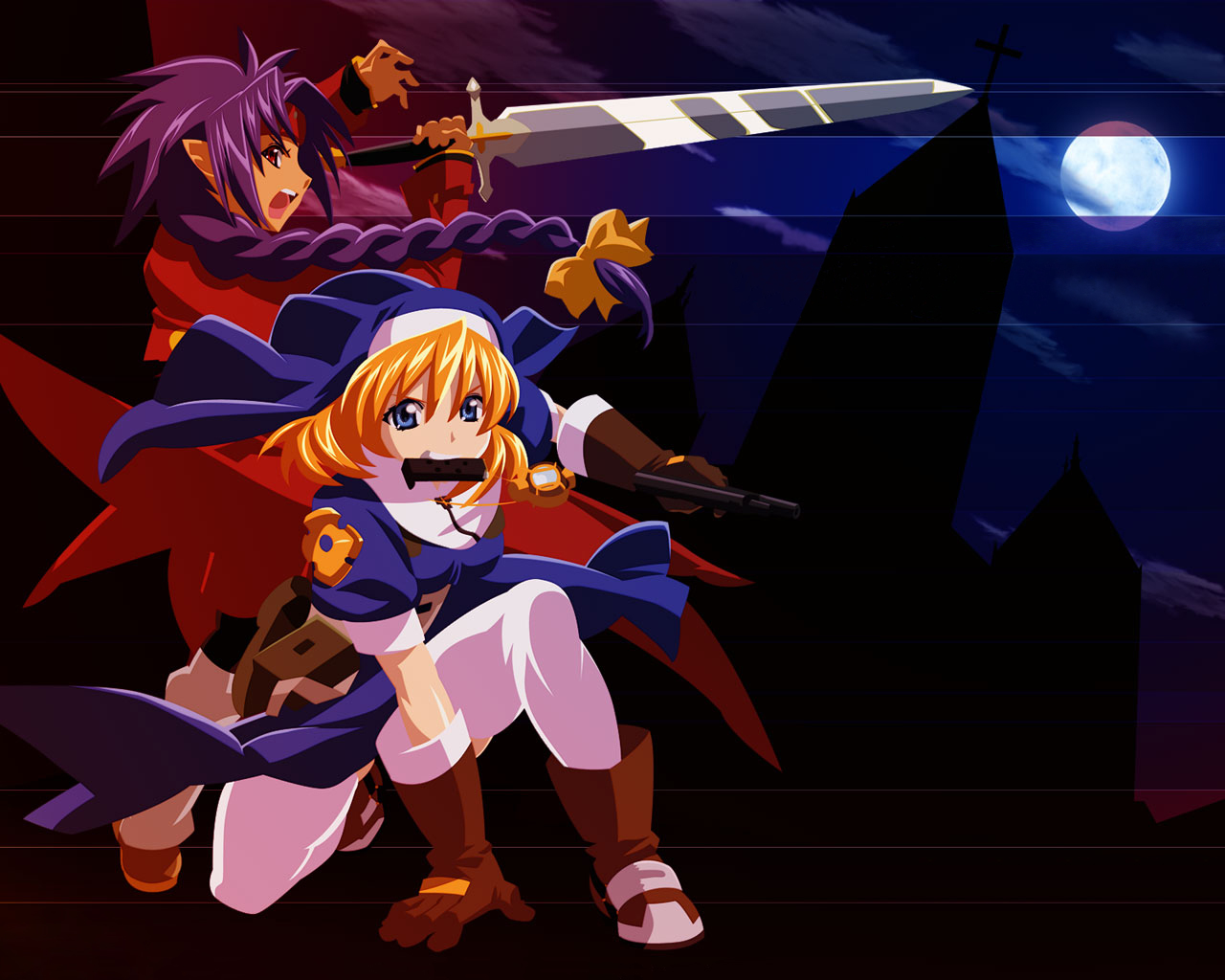 Description: A group of anime characters standing in front of a full moon sky with a sword in their hand and a sword in their other hand.