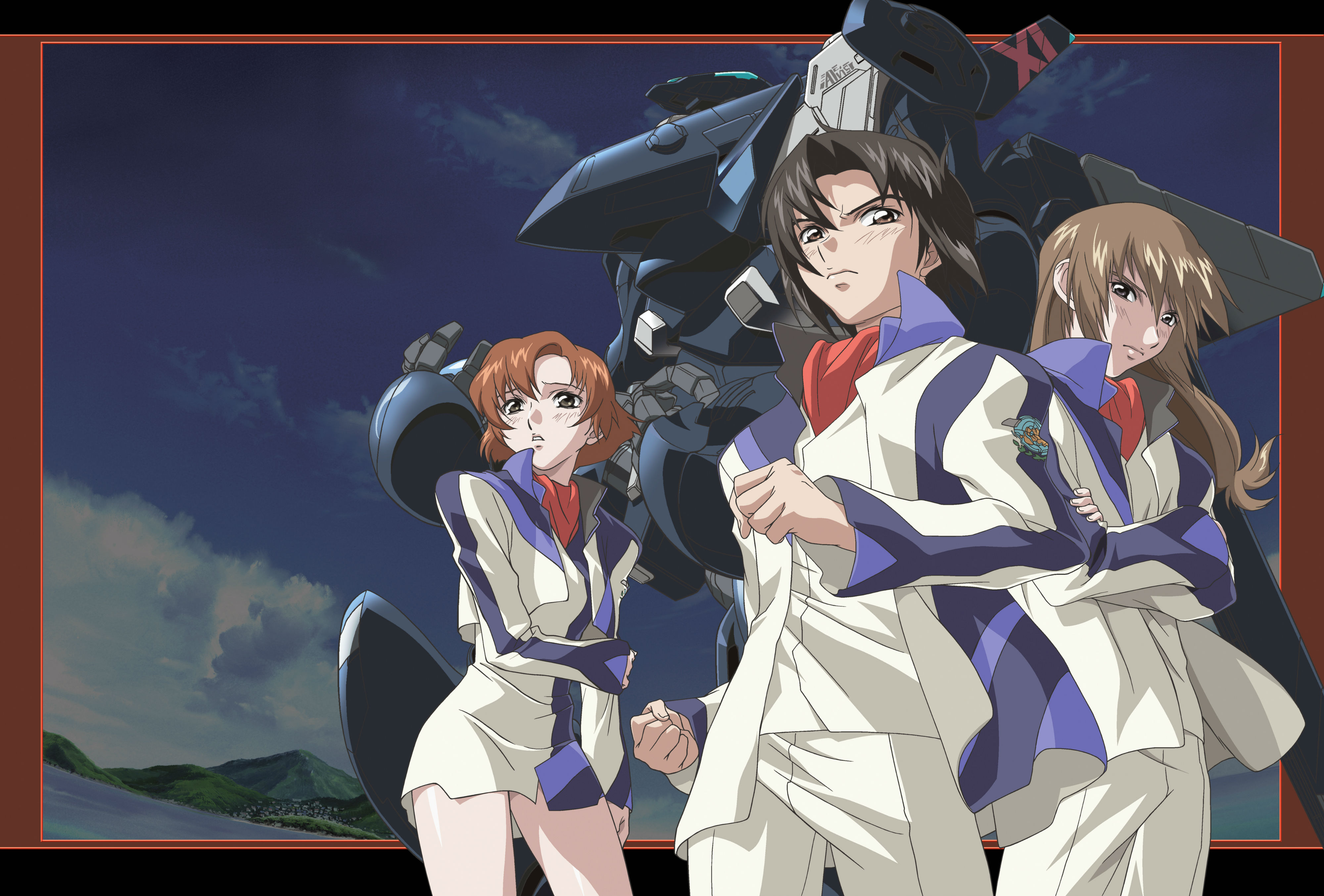 Description: A group of anime characters standing next to each other in front of a giant robot with a sky background.