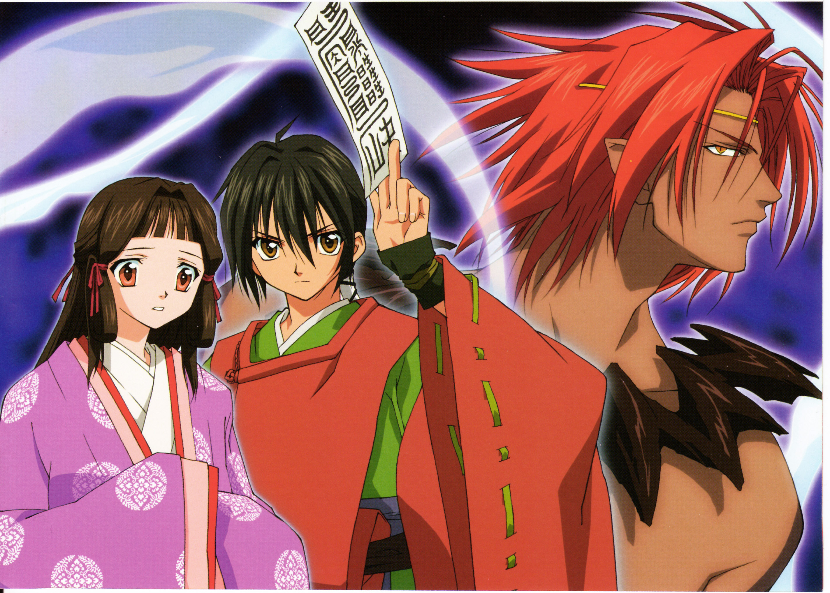 Description: A group of anime characters standing next to each other in front of a blue background with a sky background.