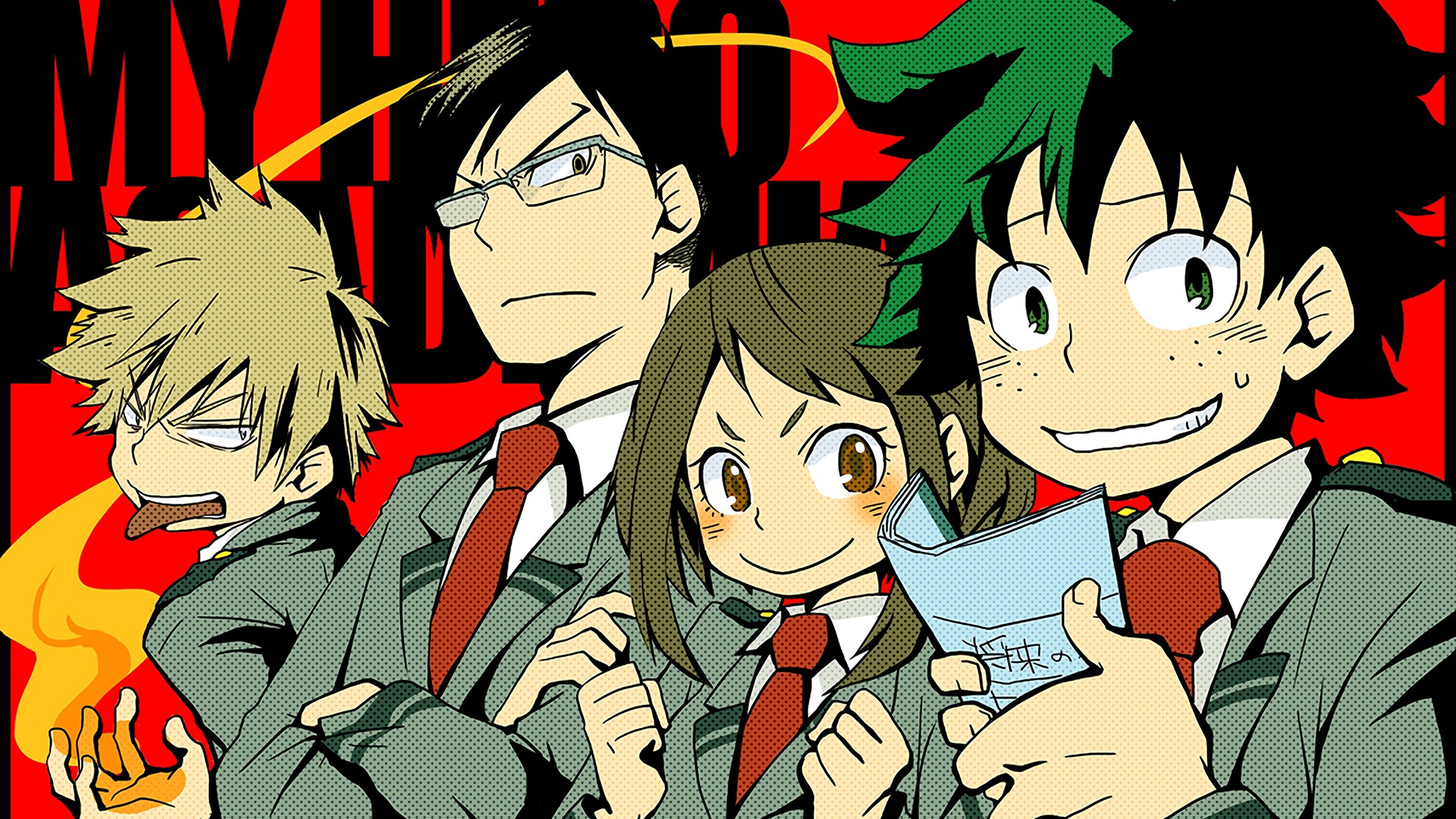 Description: A group of anime characters standing next to each other with a red background behind them and a red background behind them.