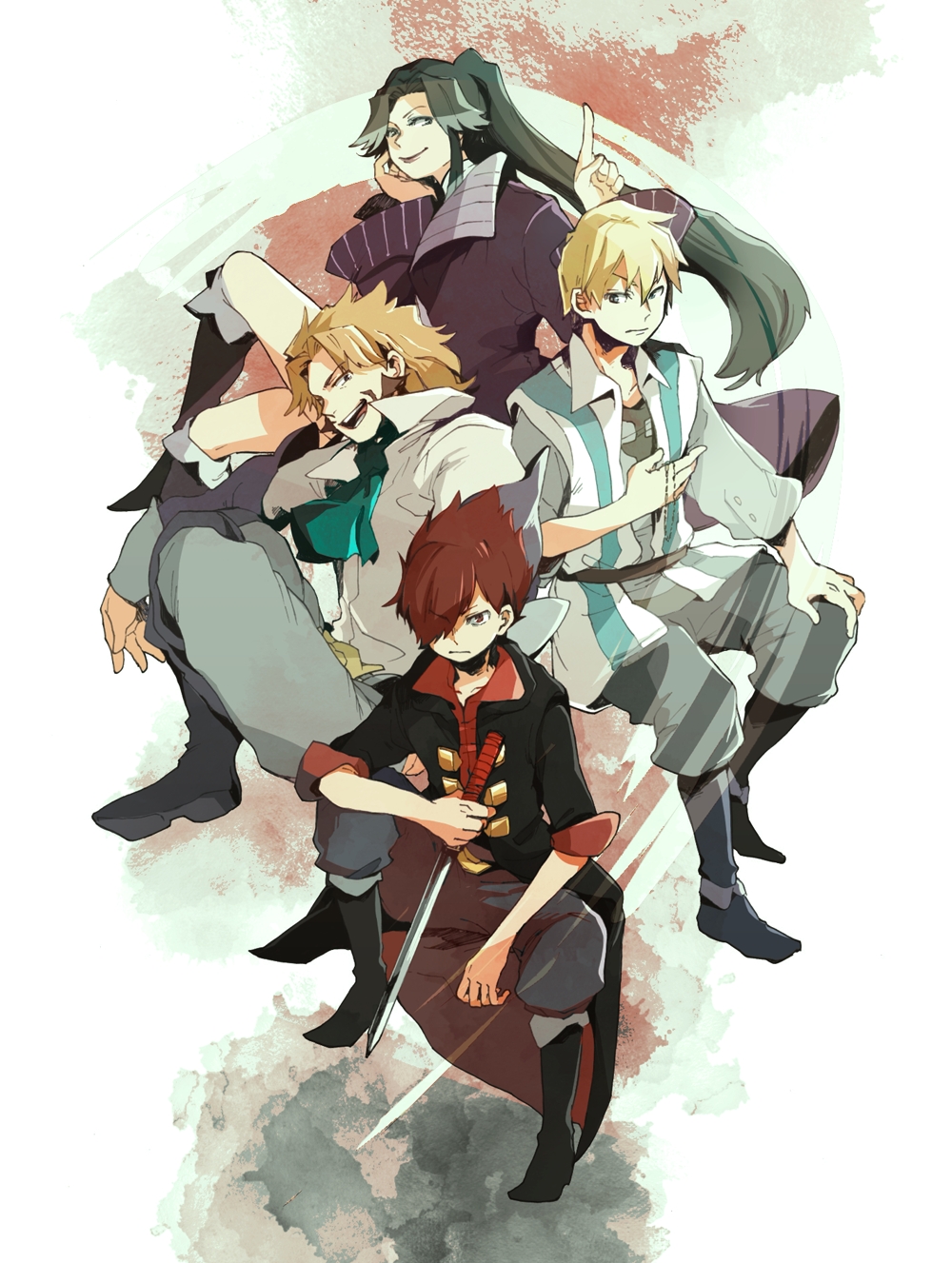 Description: A group of anime characters sitting next to each other on a white background with a red and blue background.