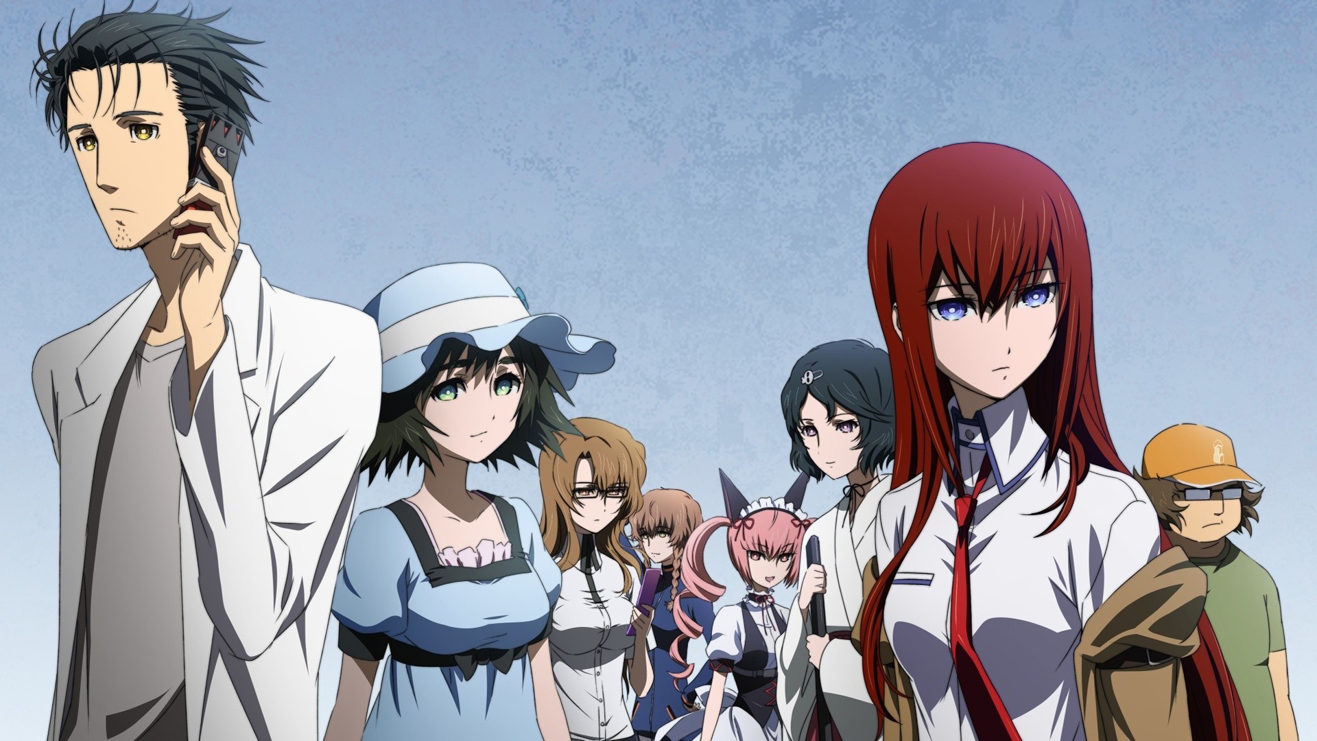 Description: A group of anime characters standing together in a line with a sky background behind them and a blue sky in the background.