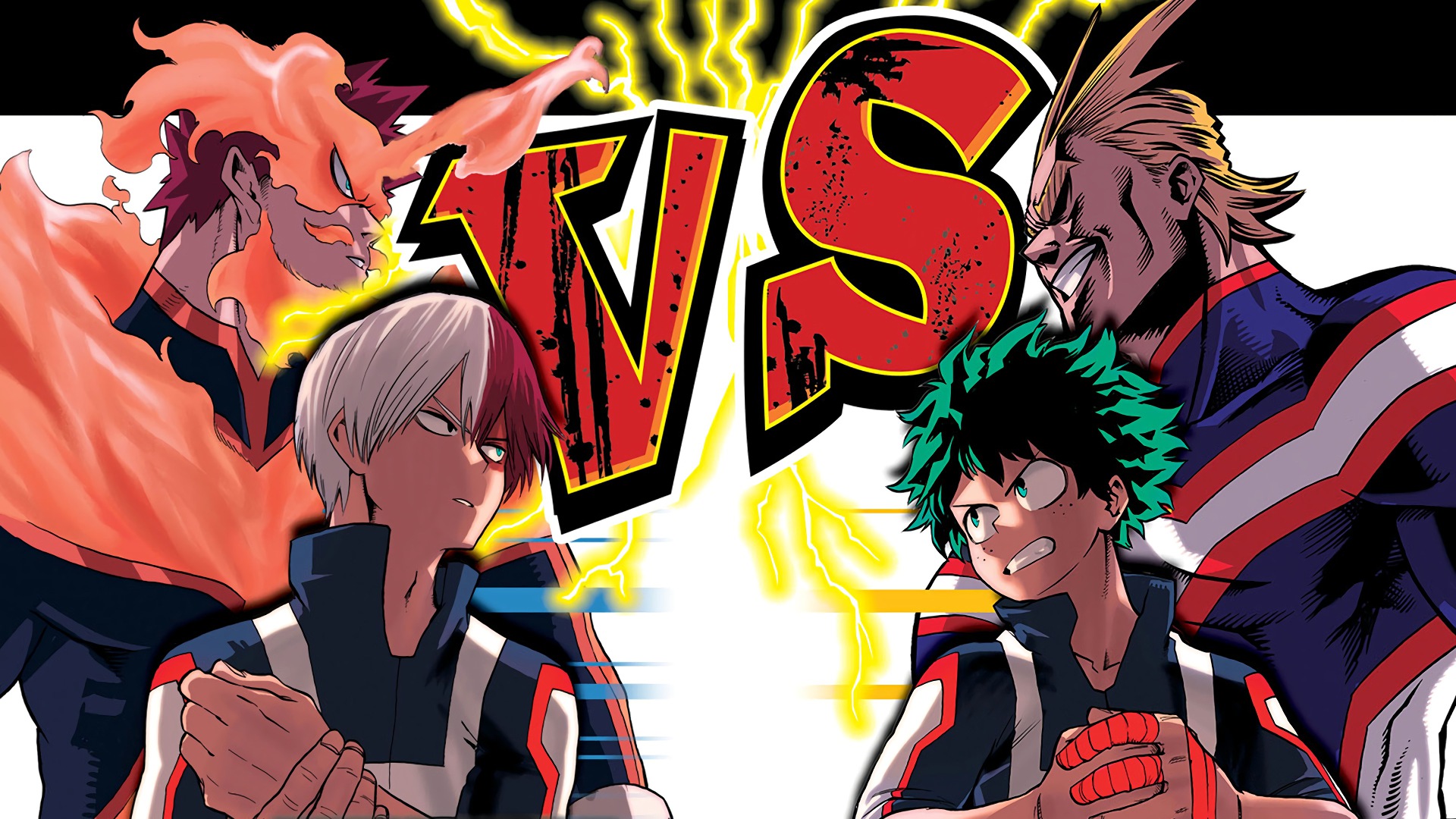 Description: A group of anime characters standing next to each other in front of a sign that says vs2s.