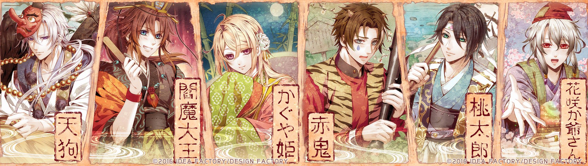 Description: A group of anime characters standing next to each other in front of a wall with asian writing on it.