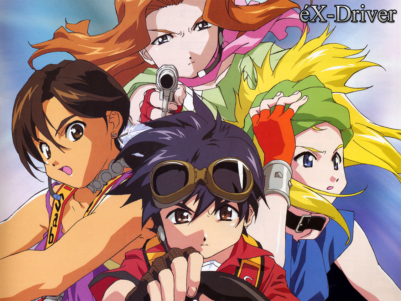 Description: A group of anime characters with guns and sunglasses on their heads and a gun in their hand.