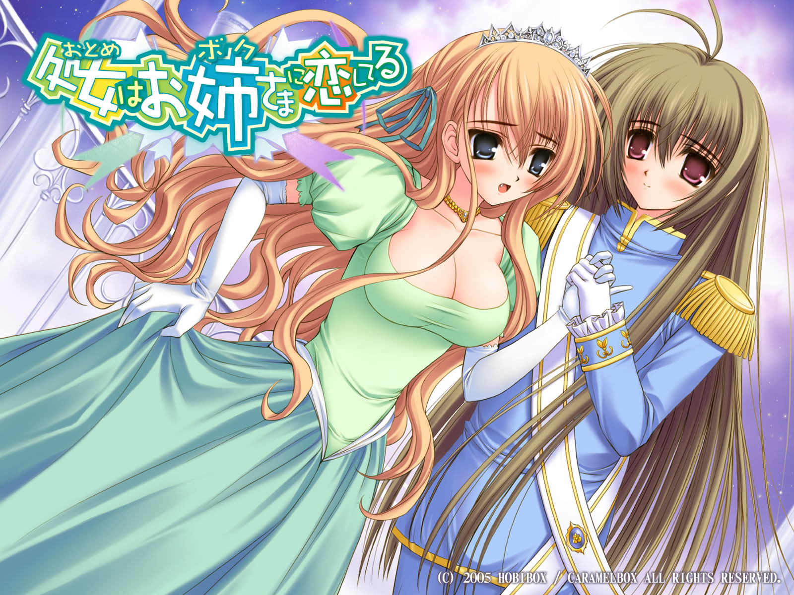 Description: A couple of anime characters hugging each other in front of a purple sky with stars and clouds behind them.