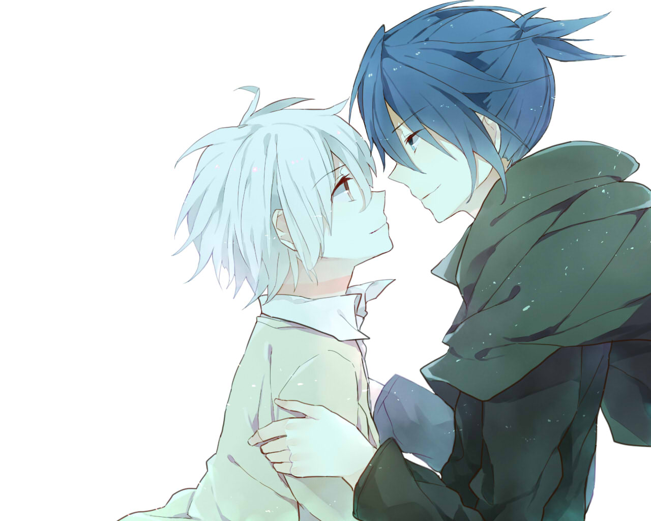 Description: Two anime characters are hugging each other in a picture with snow falling on them and one is wearing a green jacket.