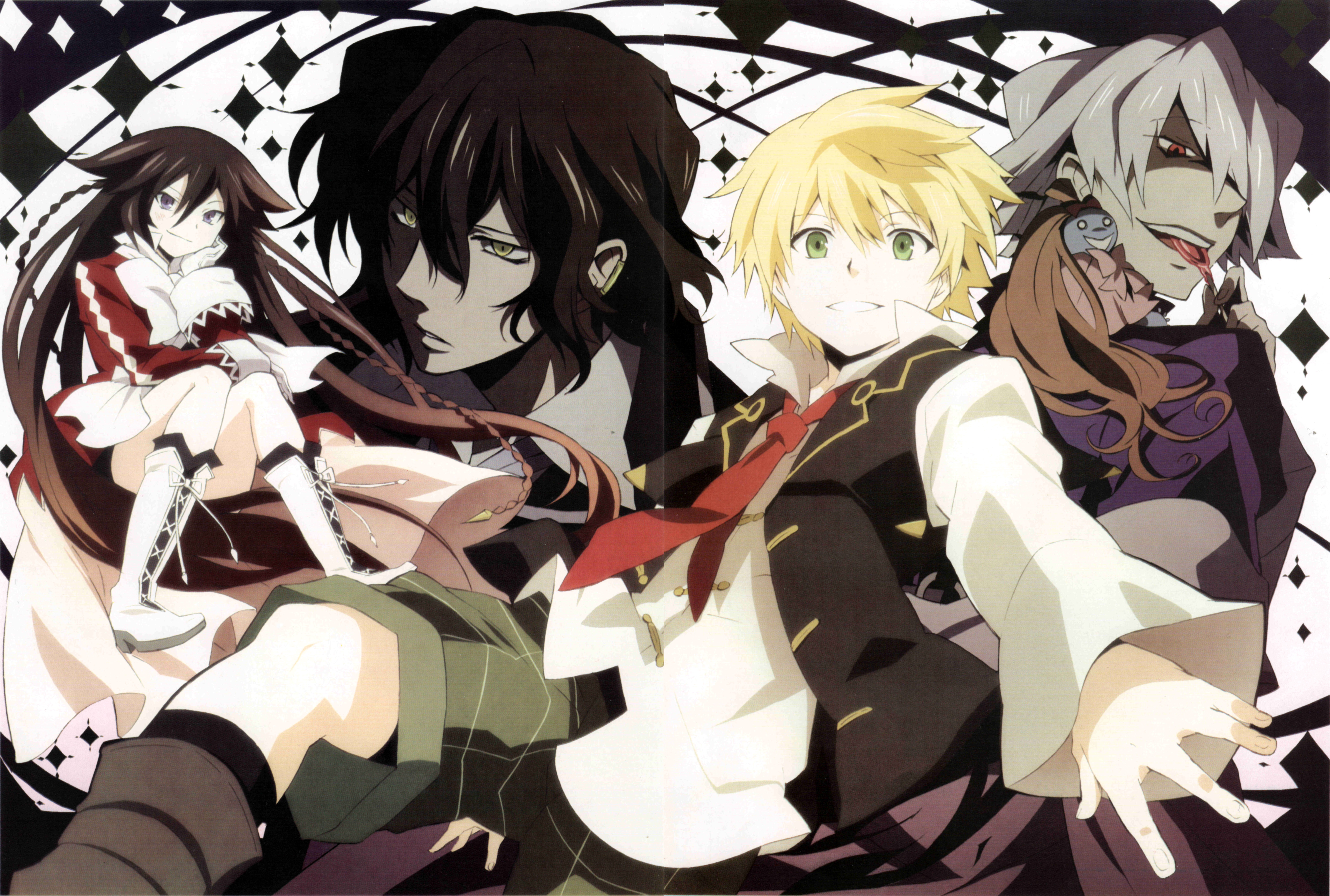 Description: A group of anime characters with long hair and ties on their backs.