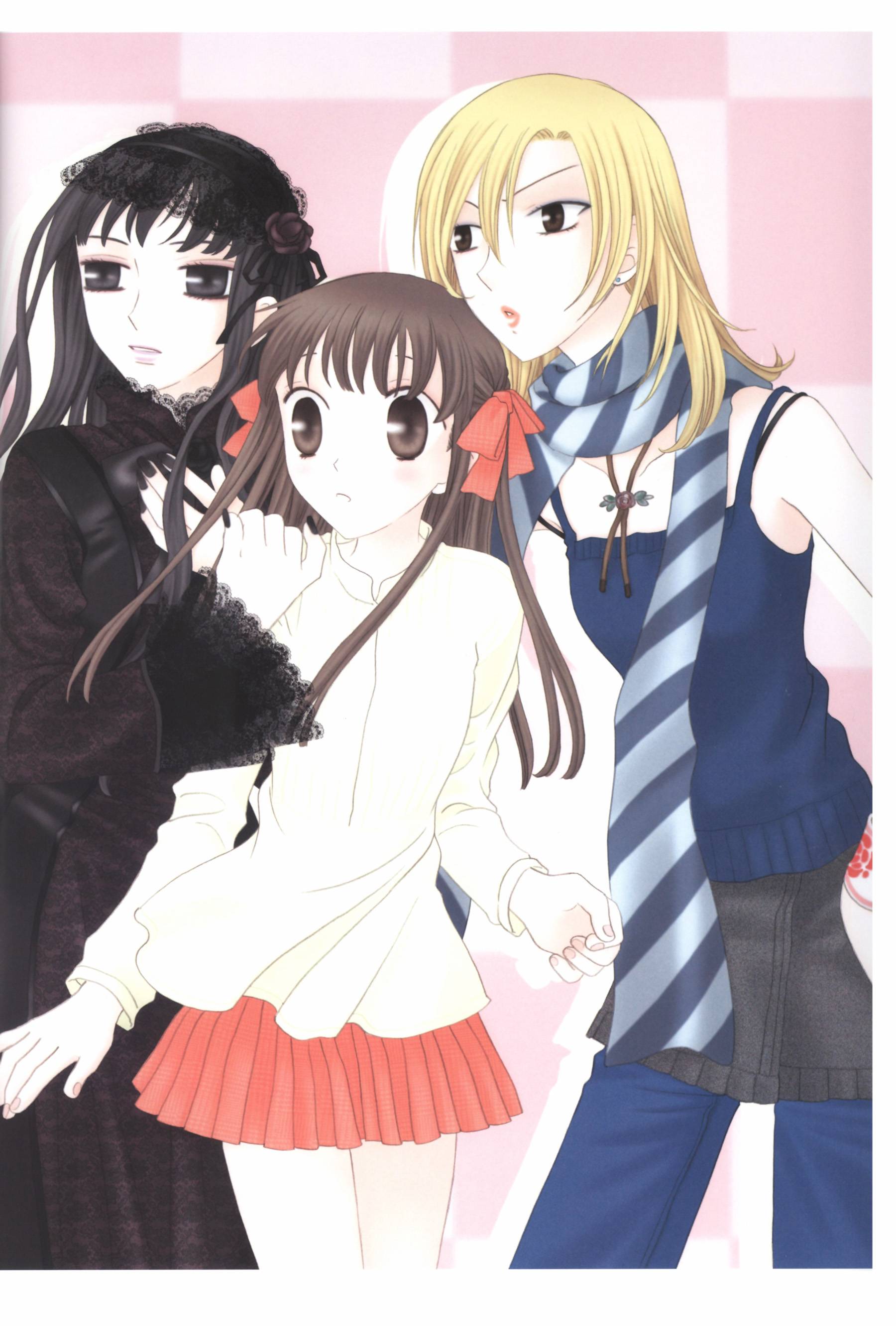 Description: Three anime characters are posing for a picture together in a pink room with a checkered wall behind them.