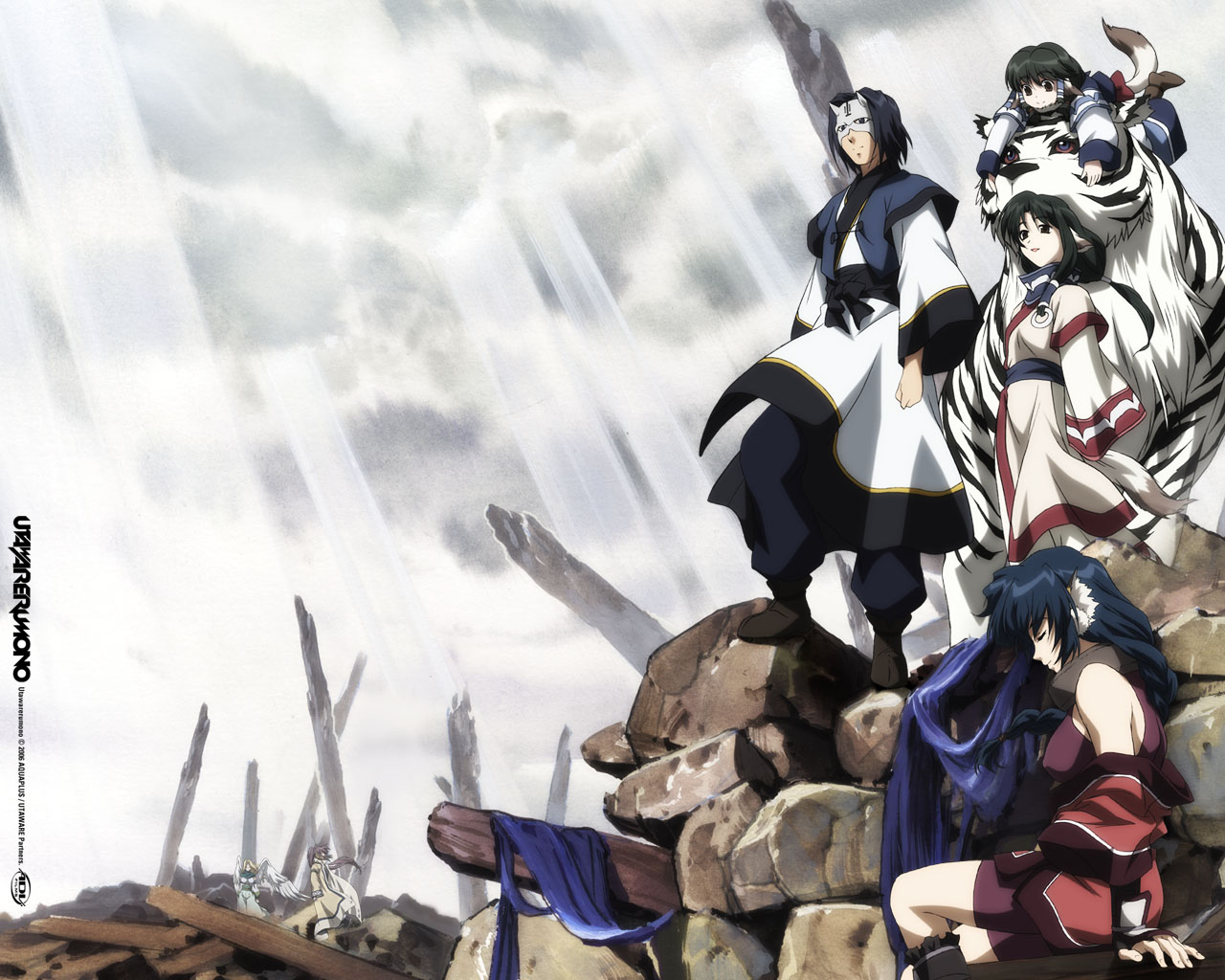 Description: A group of anime characters standing on top of a pile of rocks in the rain with swords in the background.