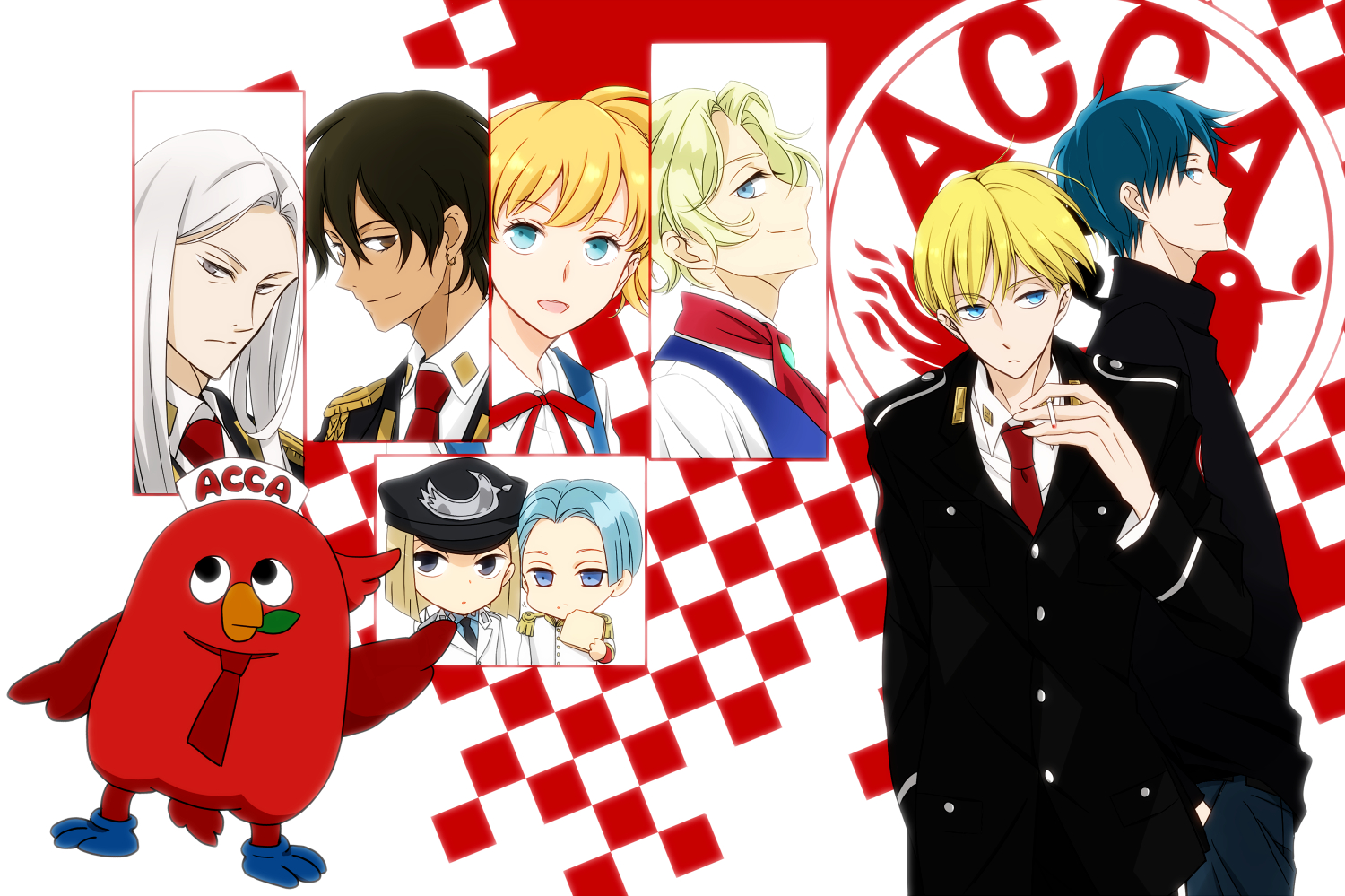 Description: A group of anime characters with a red bird in front of them and a red bird in the background.